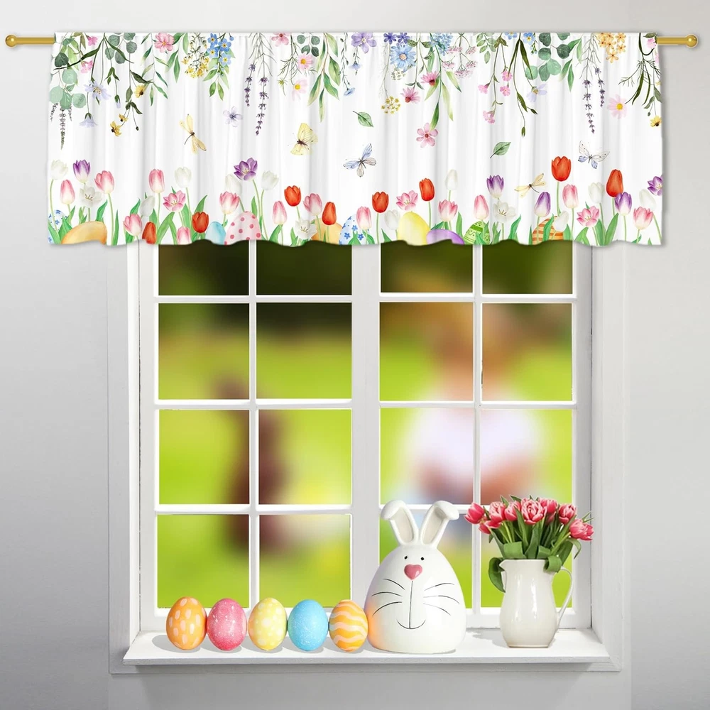 Easter Window Valance Design for a Joyful Home - Elevate your living space with our charming Easter curtains, adorned with delightful Easter tulips in seasonal colors. These curtains bring happiness and a touch of harvest to your home, symbolizing the essence of the Easter season. 1 Panel Kitchen Curtains - Perfect Size for Easy Installation. Each Easter valance curtain measures 18 inches (wide) x 54 inches (long) and is designed for easy installation on standard or decorative curtain rods. Enhance your kitchen or living room effortlessly with this versatile piece. Easter Kitchen Valance Material - Practical and Decorative. Crafted from high-quality 100% polyester fabric, these Easter valance curtains serve as stunning decor while being practical. They are machine washable at low temperatures for easy care. Simply avoid using bleach to maintain their vibrant colors. Versatile Easter Curtains for Any Occasion - Whether for daily use or during the Easter harvest holiday, these curtains add a touch of fun and harvest vibes to your home. Perfect for the living room, bedroom, kitchen, dining room, or office, they ensure a pleasant visual experience for your family. Easy Care and Maintenance - Keep your Easter window valance fresh by washing it in cold water on a gentle machine wash cycle. Iron on the backing if needed, and remember not to use bleach to preserve the vibrant colors of your lovely Easter curtains.