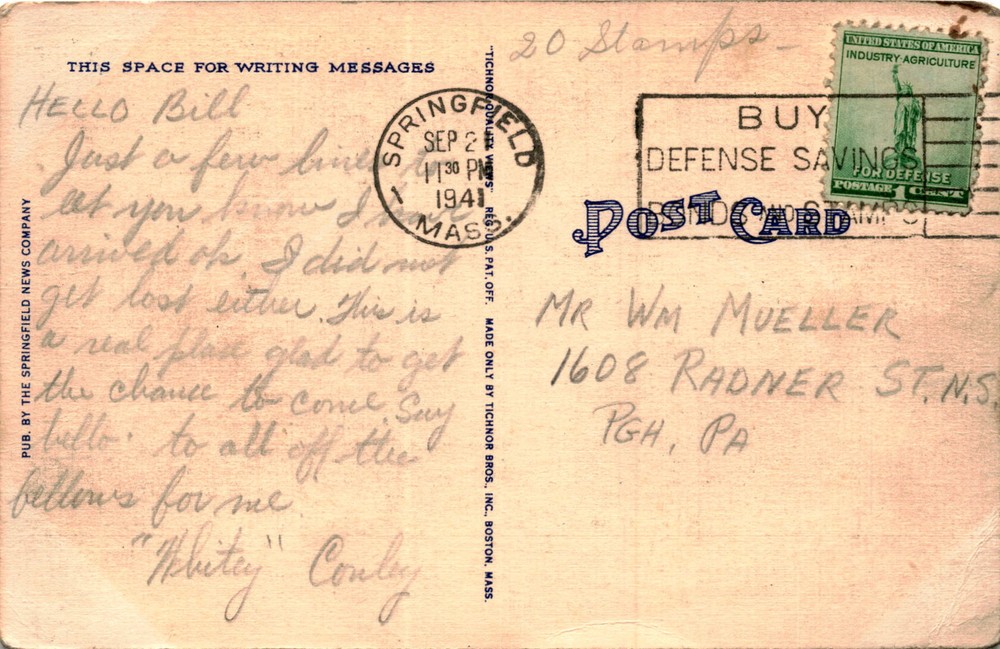 MAKE AN OFFER. THE MORE YOU BUY THE BETTER DEAL I WILL ACCEPT The front of the postcard features an aerial view of the Eastern States Exposition Grounds in Springfield, Massachusetts. The postcard was published by the Springfield News Company. The back of the postcard includes space for writing messages and is addressed to Mr. Wm Mueller in Pittsburgh, Pennsylvania.