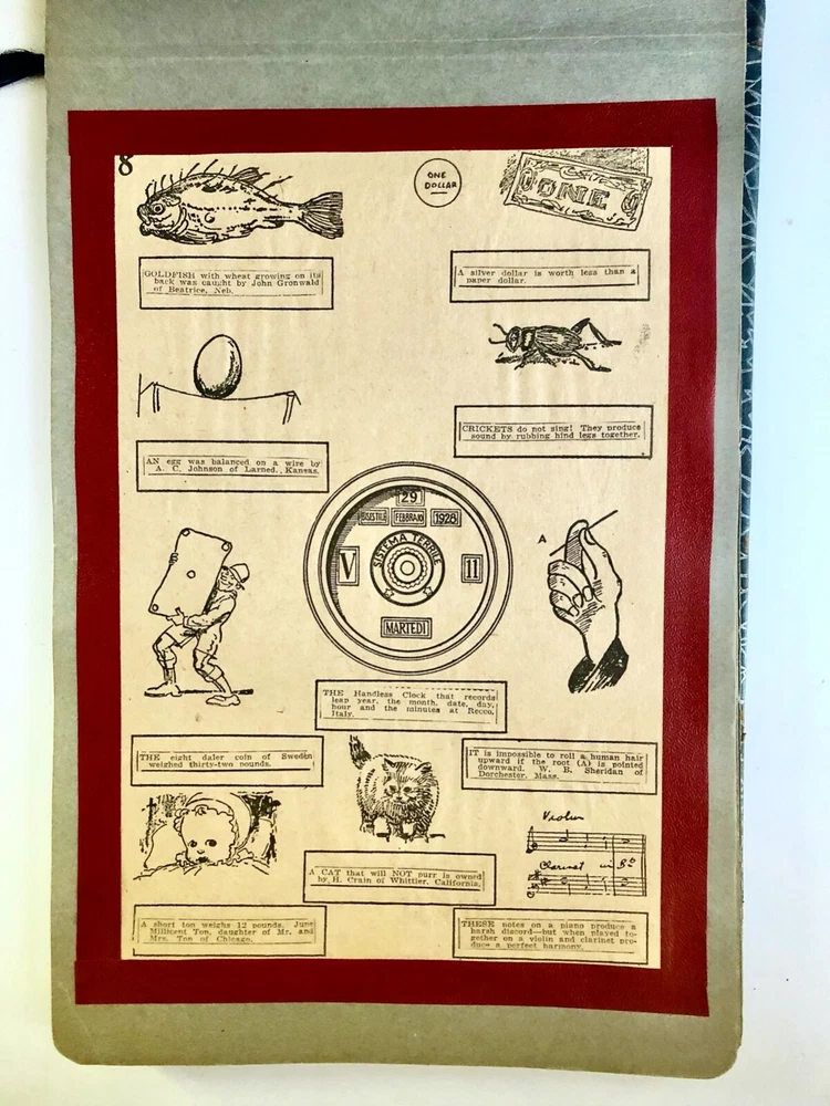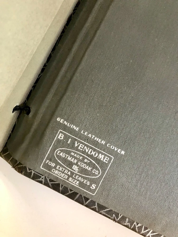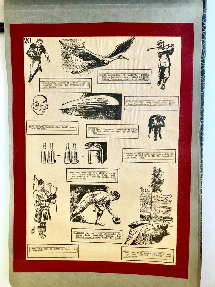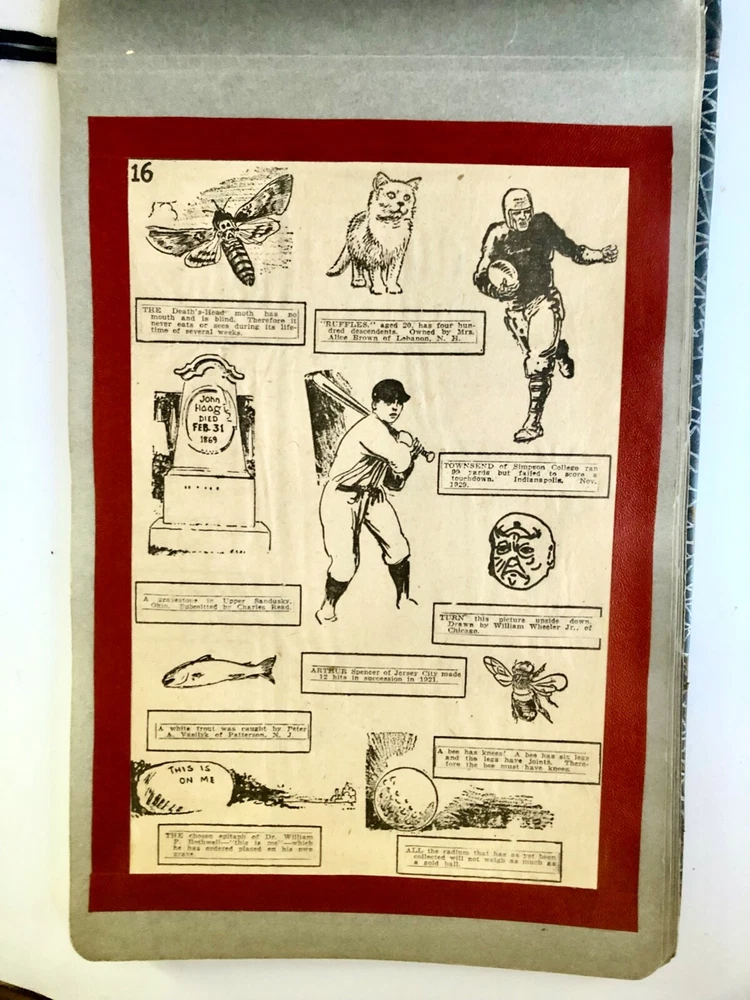 A collection of fun weird random trivia mounted on thick paper "leaves" in a leather album held together by string manufactured by Eastman Kodak Co.. Pages numbered 1 - 30 have snippets of factual trivia on a variety of topics. See images for random samples. Condition of leather album: Wear commensurates with age including loss to the black and silver exterior finish. The string is partially unraveled. Pages dog-eared. Red (tape?) has come away to some of the pages. A unique find. Album is 12.0" long, 7 3/8" tall. Questions about this item? Need more images? Please contact me, I'm happy to respond. Thanks