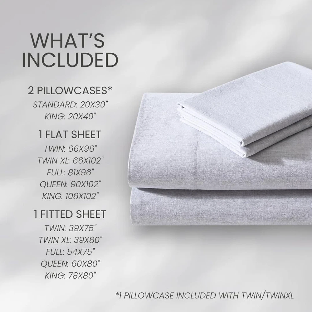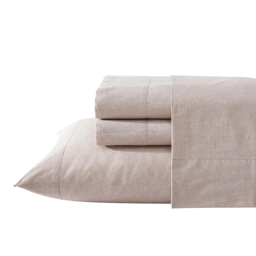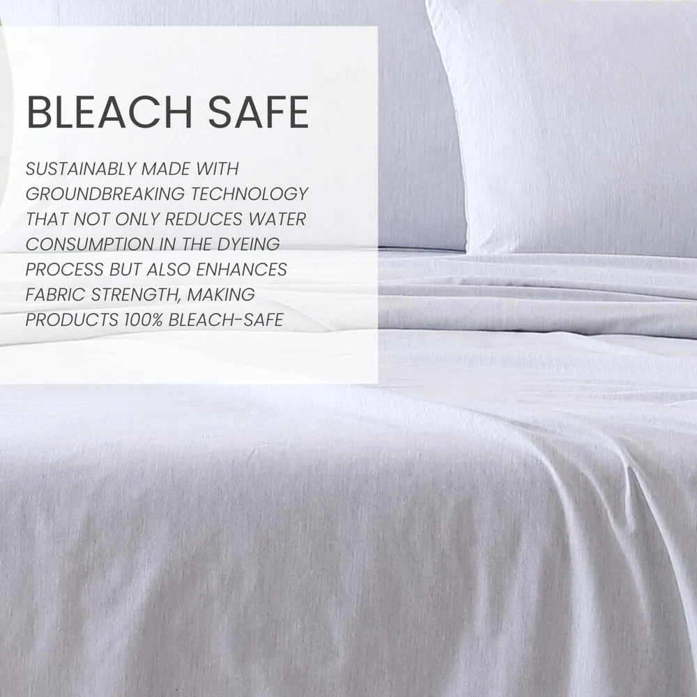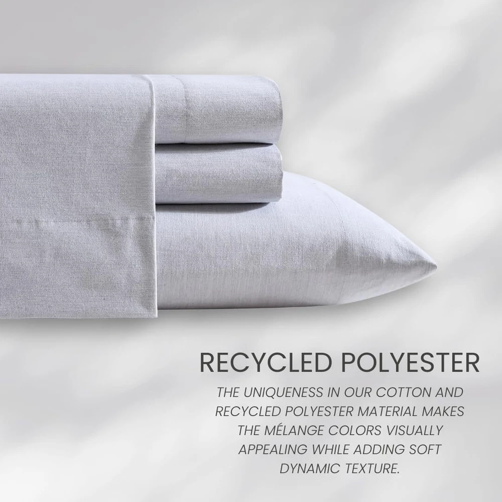 The percale weave ensures that the fabric remains cool, crisp and breathable- making it an ideal choice providing a comfortable and restful sleep experience. Sustainably made with groundbreaking technology that not only reduces water consumption in the dyeing process but also enhances fabric strength, making products 100% bleach-safe. The uniqueness in our cotton and recycled polyester material makes the mélange colors visually appealing while adding soft dynamic texture. As an added bonus, these sheets are benzoyl peroxide-resistant, rest easy without the worry of your face medication damaging your sheets. Queen Set Includes: Pillow: (2) 20"X30"/ Flat: 90"X102"/ Fitted: 60"x80"+14"