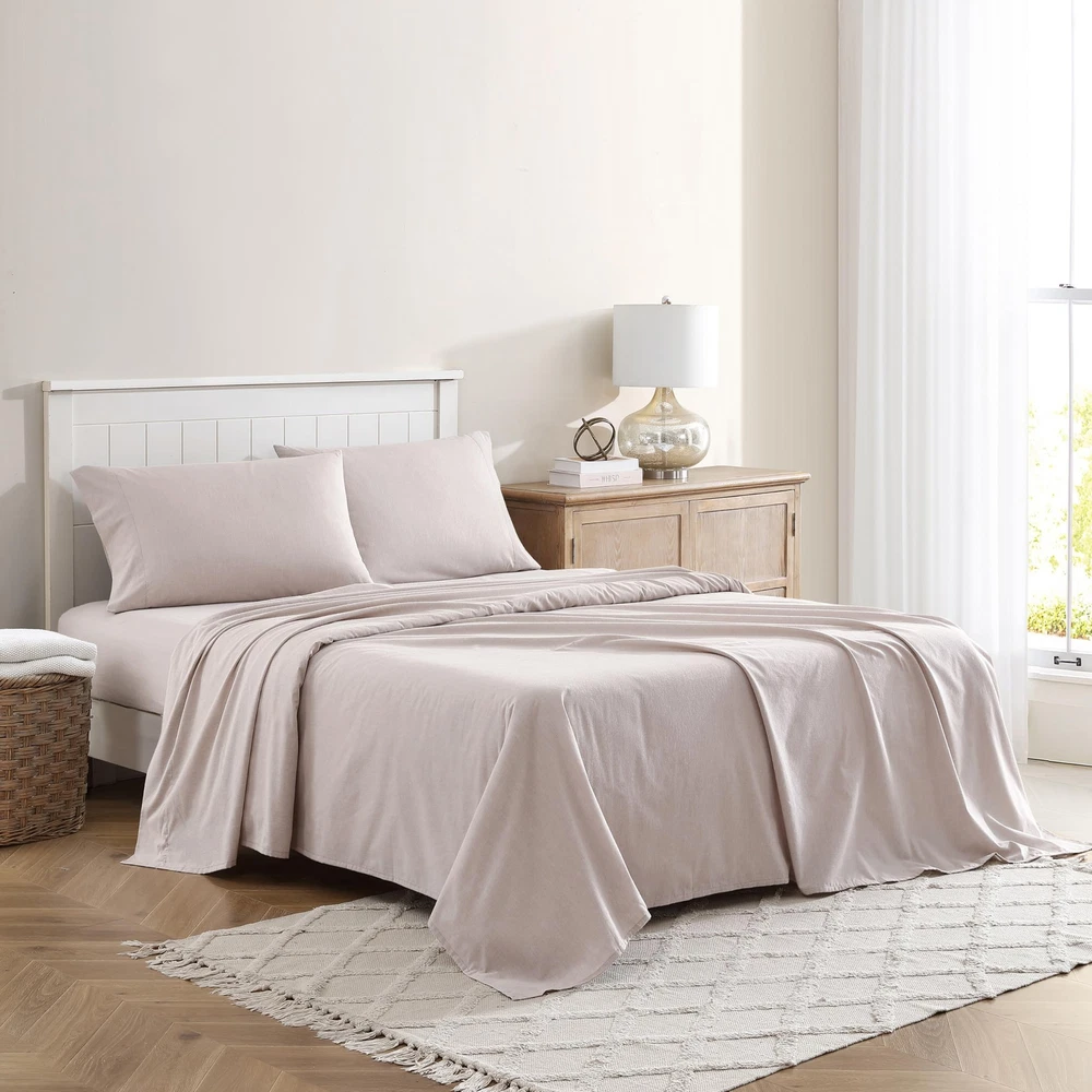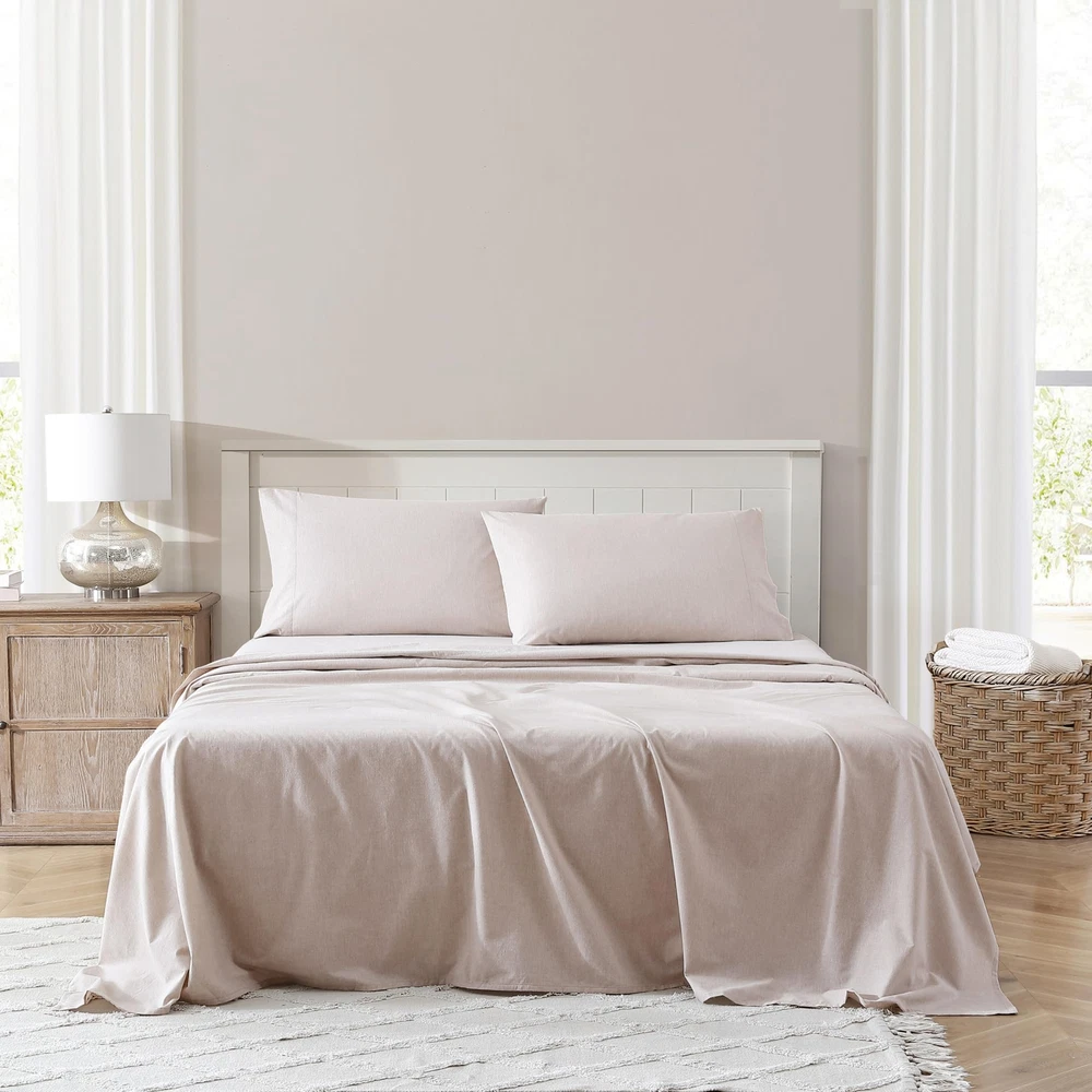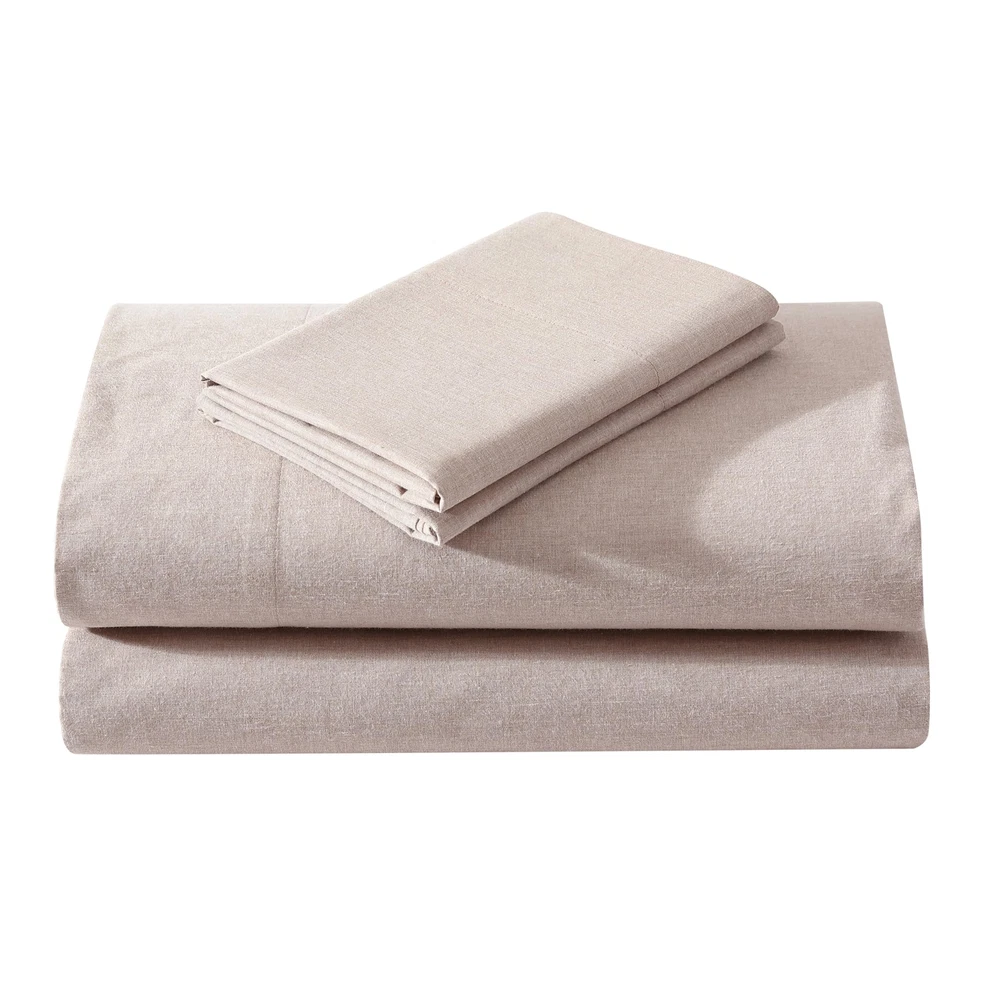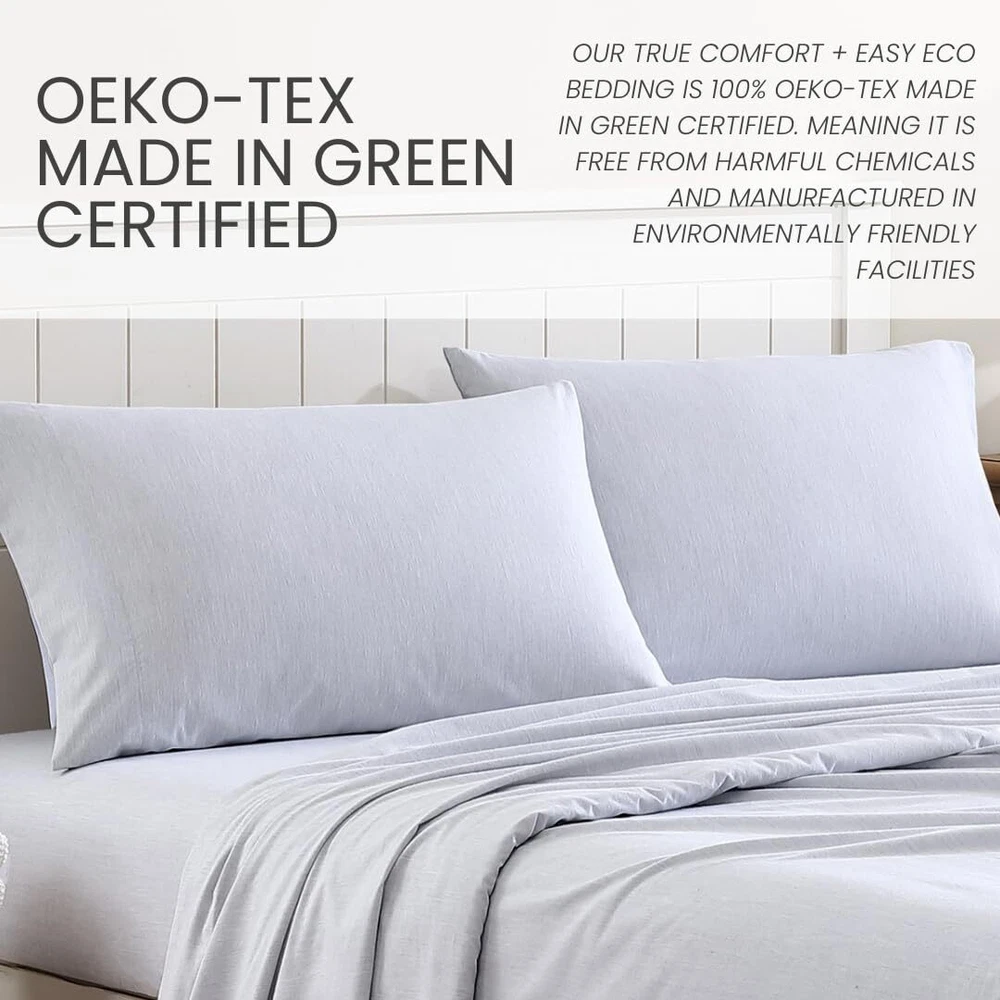 The percale weave ensures that the fabric remains cool, crisp and breathable- making it an ideal choice providing a comfortable and restful sleep experience. Sustainably made with groundbreaking technology that not only reduces water consumption in the dyeing process but also enhances fabric strength, making products 100% bleach-safe. The uniqueness in our cotton and recycled polyester material makes the mélange colors visually appealing while adding soft dynamic texture. As an added bonus, these sheets are benzoyl peroxide-resistant, rest easy without the worry of your face medication damaging your sheets. Queen Set Includes: Pillow: (2) 20"X30"/ Flat: 90"X102"/ Fitted: 60"x80"+14"