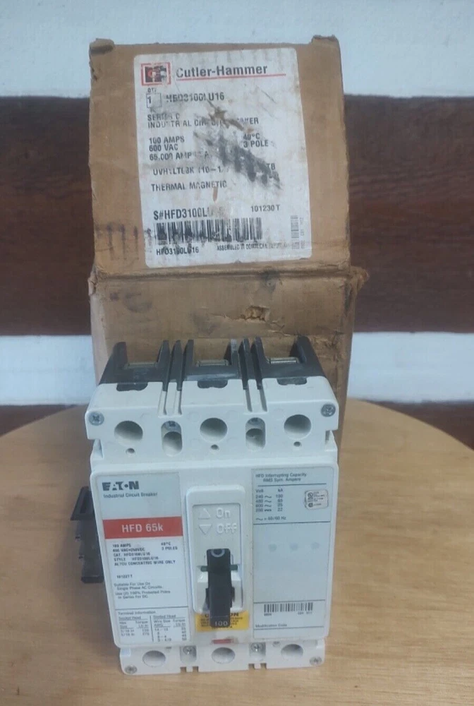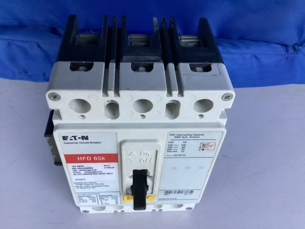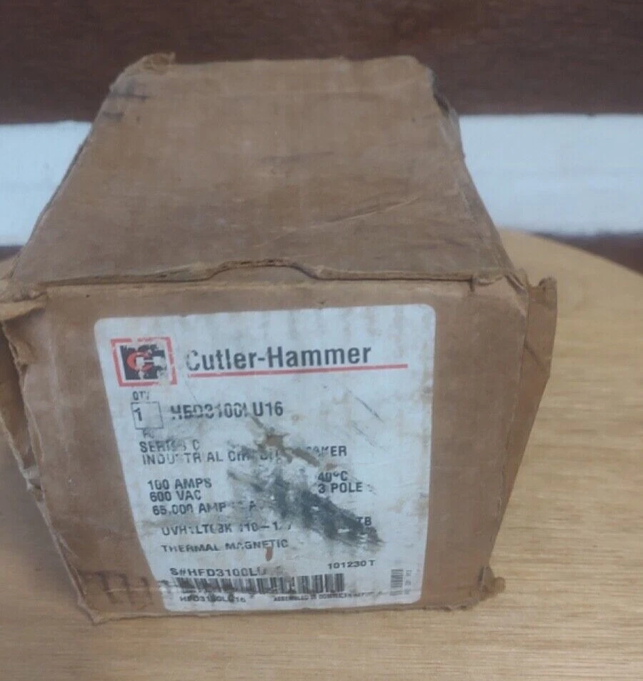 Eaton HFD3100LU16 3 pole 600v ac/dc 100amp rated circuit breaker with factory installed UV trip unit. The breaker is new.The box has seen better days. I’m not a reseller or someone who buys up lots of item to sell online. I own an electrical service company the item listed here is slow moving or dead inventory that I’m trying to clear out. Please look carefully at the pictures and description if you have any concerns bring them to my attention before purchasing.