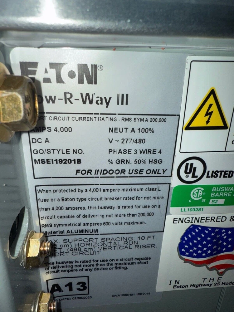 Eaton Pow-R-Way III Busway Section 4000A 277/480V 3PH 4W MESI1201B 4000 Amp Bustap Item pictured will be exact item you receive unless multiple quantities listed. Please review all pictures carefully. Please ask any questions prior to purchase. Fast Shipping: We strive to ship all orders same day if placed before 3:00 PM EST. If you need next-day or other expediting shipping please contact us for a shipping quote. Warehouse location: