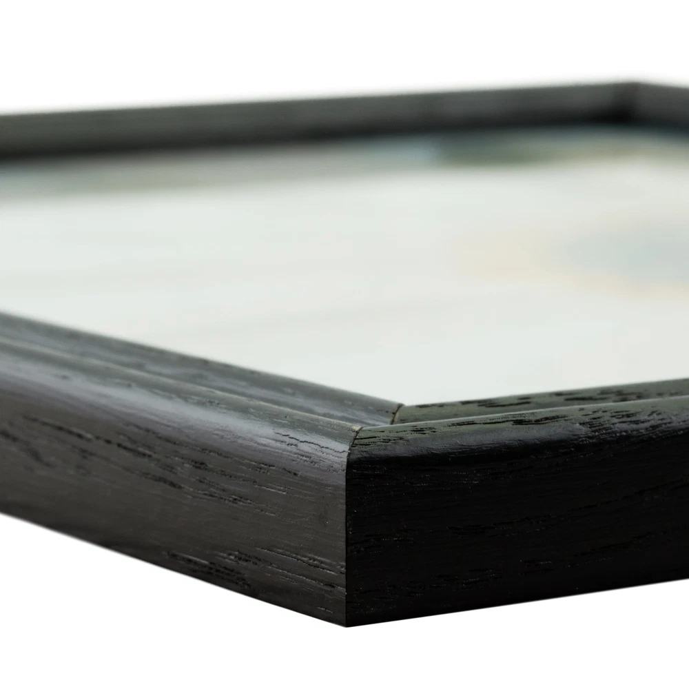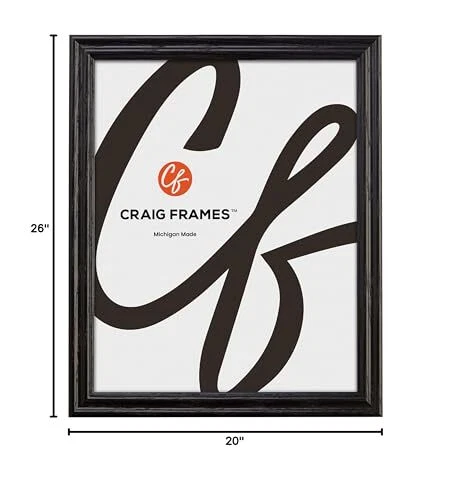 This simple black picture frame offers a winning combination of quality, finish and affordability. The Wiltshire ash frame series are constructed from North American ash trees. This .75" moulding—finished with semi-gloss Ebony stain—showcases wood grain patterns unique with each frame. The traditional styling of the Wiltshire ash is ideal for a wide range of prints and decor. Traditional style; shiny black with wood grain finish Frame includes: white mat, acrylic facing, cardboard backing and hanging kit. Assembly required Matted frame is designed to display a 14x20 print. Actual mat opening is 13.5x19.5. Frame will display a 19x25 print without the matting. Frame moulding is 0.75 inch wide; solid Ash wood Frame is designed for WALL HANGING only (hardware allows for portrait or landscape orientation)