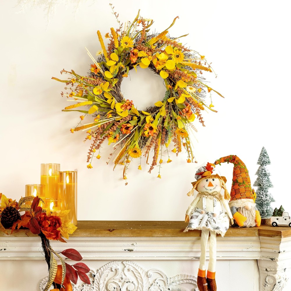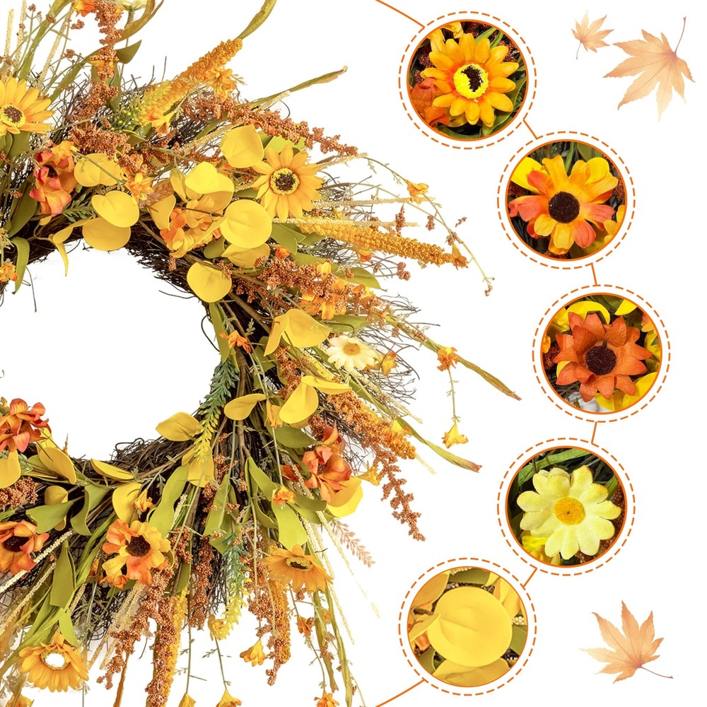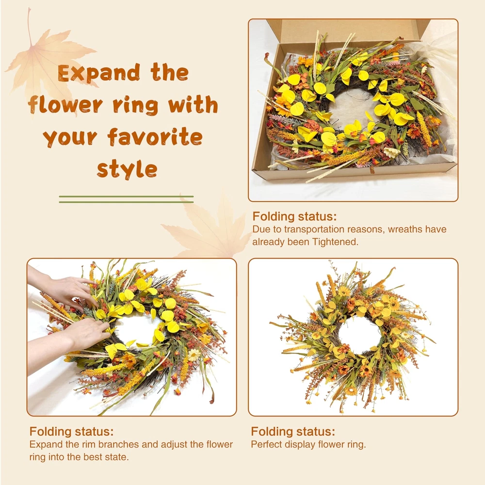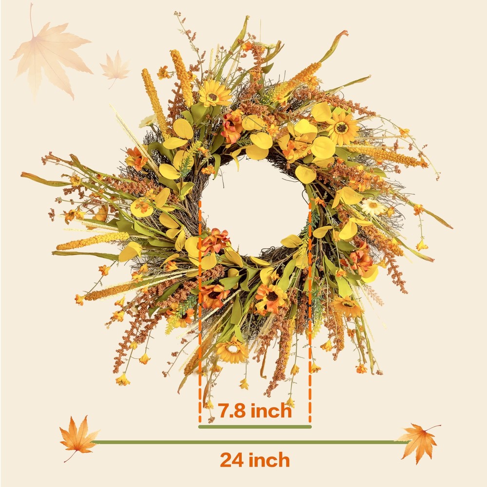 ECLECTICIA-Fall Wreaths for Front Door-24Inch Artificial Autumn Wreath,Fall Wreath with Colorful Daisies and Grains,for Front Door,Wall,Window,Farmhouse Decor and Thanksgiving Decor Product Details Color: Orange Daisy Wreaths Brand: ECLECTICIA Material: Grapevine Paper Plastic Polyester Mounting Type: Door Mount Wall Mount Shape: Round Product Dimensions: 24"D x 24"W x 3.2"H Occasion: Farmhouse,Front doors,porches,windows,fireplaces,walls,handrails, stairs,cabinets,weddings,parties,offices,Thanksgiving, Christmas,Halloween and more See more Manufacturer: ECLECTICIA Color: Orange Daisy Wreaths Brand: ECLECTICIA Material: Grapevine Paper Plastic Polyester Mounting Type: Door Mount Wall Mount Shape: Round Product Dimensions: 24"D x 24"W x 3.2"H Occasion: Farmhouse,Front doors,porches,windows,fireplaces,walls,handrails, stairs,cabinets,weddings,parties,offices,Thanksgiving, Christmas,Halloween and more Manufacturer: ECLECTICIA Item Weight: 1.55 pounds Country of Origin: China Item model number: YCWHY-011 Date First Available: October 30, 2024 AuthenticityECLECTICIA Fall Door Wreath,Each One Handmade,This Fall Wreath is Full of Flowers and Foliage,Adorned With a Plethora of Orange and Yellow Daisies,Ears of Grain,and Greens,and The Overall Look is Authentically Full,Bringing The Wreath Closer To Fall MultipurposeThis Fall Wreath Can be Easily Hung Anywhere,Such as Front Door,Windows,Fireplace, Walls,Banisters,Stairs,Cabinets,Weddings,Parties and Thanksgiving Etc,It is The Perfect Fall Decorations For Home Suitable SizeECLECTICIA Fall Wreath Fluffed Outer Diameter Size up to 24Inch,Depth of 3.5lnch, Adjiust Adjust The Curvature of The Branch,The Wreaths Will Appear More Plump and Large,The Wreath is Simple and Generous,Bright Colors,Absolutely Brighten up Your Home Special MaterialWreath Base Handmade From Real Rattan,Other Parts are Made of Plastic and Polyester Fiber,Due to Long Time Transportation,The Rattan Will Be Squeezed,Therefore,When Adjusting The Wreath,The Rattan Will Be Slightly Detached,But it Will Not Affect The Overall Use of The Wreath Warm TipsThe Wreaths May be Squeezed and Deformed During Shipping,After Receiving The Wreaths,You Need to Unfold Them to Get The Best Appearance,Note That if You Use The Fall Wreaths Outdoors,Please Make Sure To Hang Them To Avoid Rain and Snow If You Have Any Questions About Our Products,Please Let Us Know,We Will Definitely Give You a Satisfact This fall wreath is filled with yellow and orange daisies as well as different colors of fall leaves and ears We are sure you will receive many compliments when your guests or neighbors see this fall front door wreath