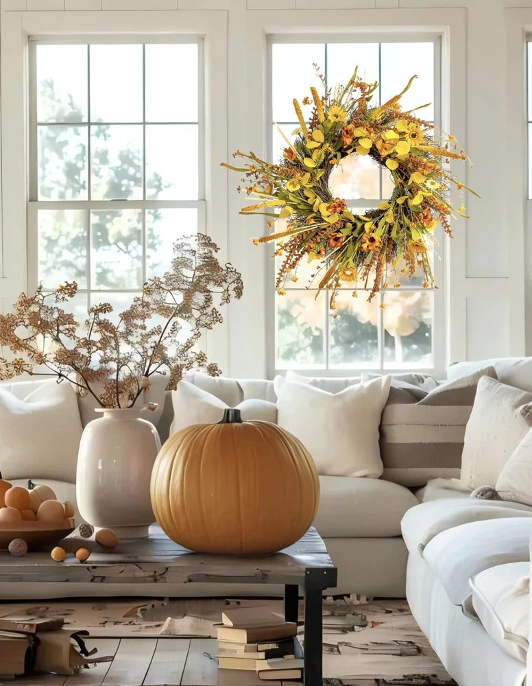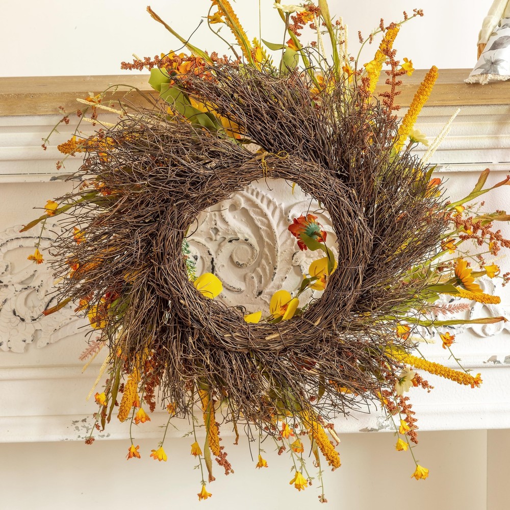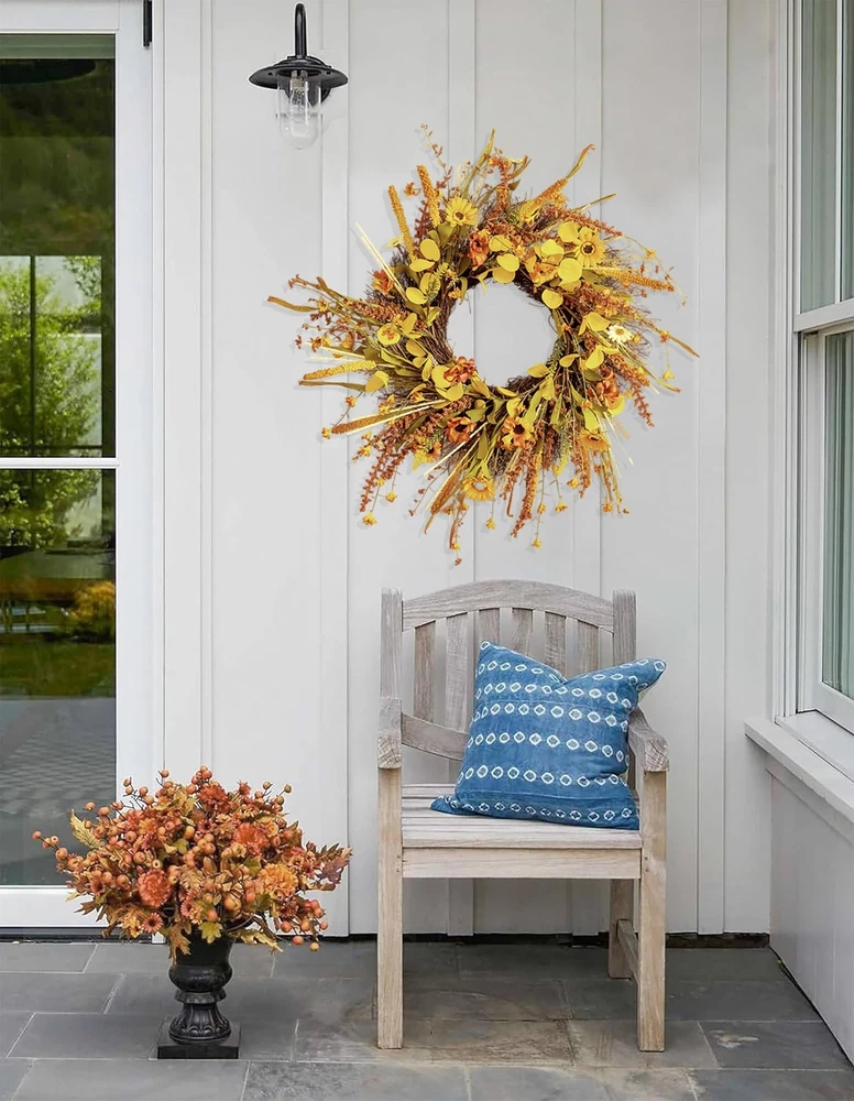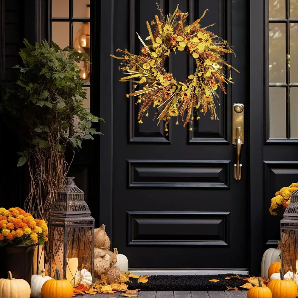 ECLECTICIA-Fall Wreaths for Front Door-24Inch Artificial Autumn Wreath,Fall Wreath with Colorful Daisies and Grains,for Front Door,Wall,Window,Farmhouse Decor and Thanksgiving Decor Product Details Color: Orange Daisy Wreaths Brand: ECLECTICIA Material: Grapevine Paper Plastic Polyester Mounting Type: Door Mount Wall Mount Shape: Round Product Dimensions: 24"D x 24"W x 3.2"H Occasion: Farmhouse,Front doors,porches,windows,fireplaces,walls,handrails, stairs,cabinets,weddings,parties,offices,Thanksgiving, Christmas,Halloween and more See more Manufacturer: ECLECTICIA Color: Orange Daisy Wreaths Brand: ECLECTICIA Material: Grapevine Paper Plastic Polyester Mounting Type: Door Mount Wall Mount Shape: Round Product Dimensions: 24"D x 24"W x 3.2"H Occasion: Farmhouse,Front doors,porches,windows,fireplaces,walls,handrails, stairs,cabinets,weddings,parties,offices,Thanksgiving, Christmas,Halloween and more Manufacturer: ECLECTICIA Item Weight: 1.55 pounds Country of Origin: China Item model number: YCWHY-011 Date First Available: October 30, 2024 AuthenticityECLECTICIA Fall Door Wreath,Each One Handmade,This Fall Wreath is Full of Flowers and Foliage,Adorned With a Plethora of Orange and Yellow Daisies,Ears of Grain,and Greens,and The Overall Look is Authentically Full,Bringing The Wreath Closer To Fall MultipurposeThis Fall Wreath Can be Easily Hung Anywhere,Such as Front Door,Windows,Fireplace, Walls,Banisters,Stairs,Cabinets,Weddings,Parties and Thanksgiving Etc,It is The Perfect Fall Decorations For Home Suitable SizeECLECTICIA Fall Wreath Fluffed Outer Diameter Size up to 24Inch,Depth of 3.5lnch, Adjiust Adjust The Curvature of The Branch,The Wreaths Will Appear More Plump and Large,The Wreath is Simple and Generous,Bright Colors,Absolutely Brighten up Your Home Special MaterialWreath Base Handmade From Real Rattan,Other Parts are Made of Plastic and Polyester Fiber,Due to Long Time Transportation,The Rattan Will Be Squeezed,Therefore,When Adjusting The Wreath,The Rattan Will Be Slightly Detached,But it Will Not Affect The Overall Use of The Wreath Warm TipsThe Wreaths May be Squeezed and Deformed During Shipping,After Receiving The Wreaths,You Need to Unfold Them to Get The Best Appearance,Note That if You Use The Fall Wreaths Outdoors,Please Make Sure To Hang Them To Avoid Rain and Snow If You Have Any Questions About Our Products,Please Let Us Know,We Will Definitely Give You a Satisfact This fall wreath is filled with yellow and orange daisies as well as different colors of fall leaves and ears We are sure you will receive many compliments when your guests or neighbors see this fall front door wreath