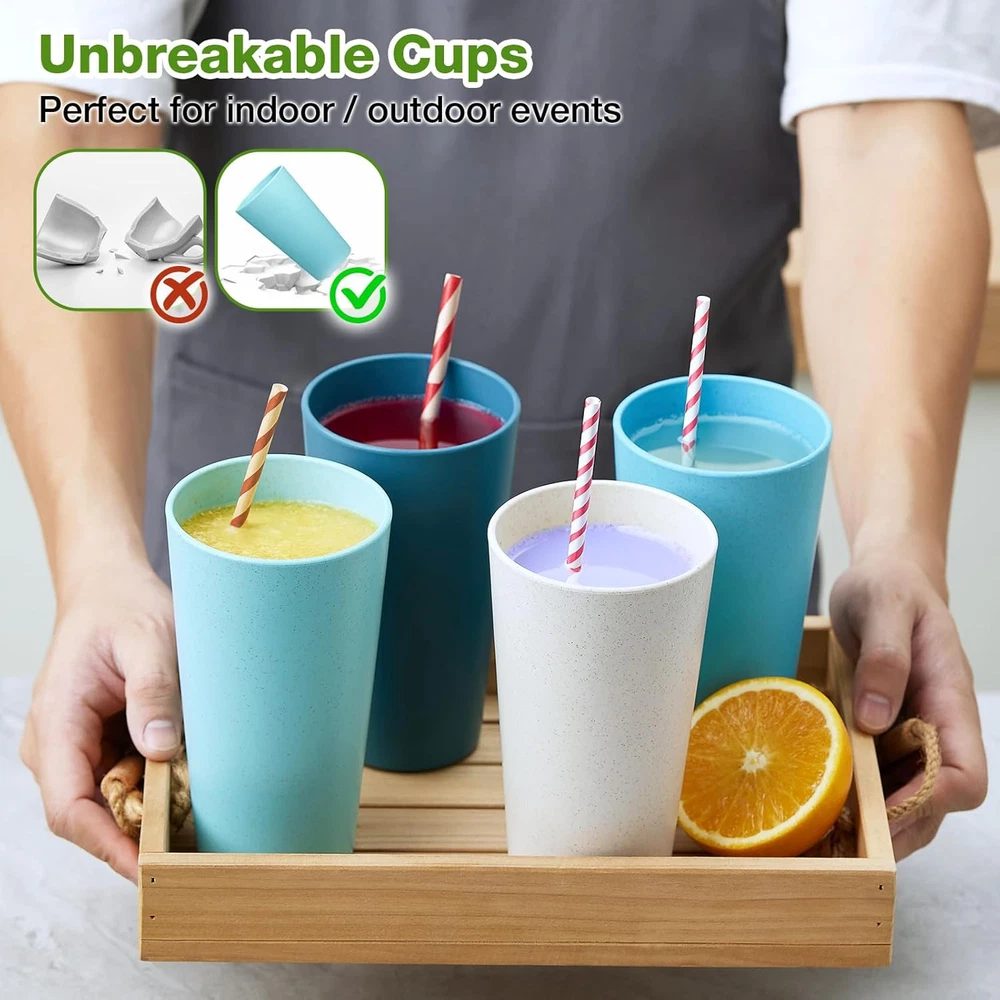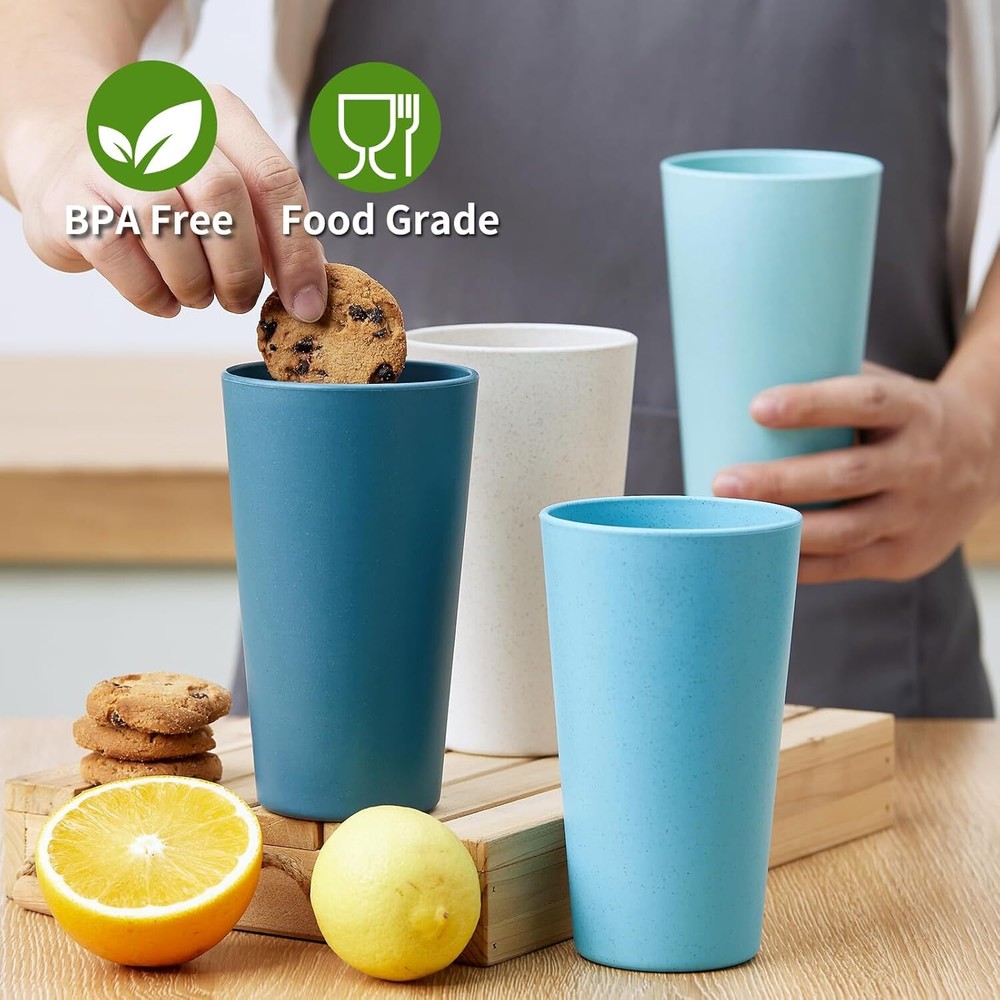 Wheat Straw Cups Set of 8, 20 oz Unbreakable Drinking Cup, Chip Ocean Product Details Brand: Hlukana Color: Ocean Special Feature: Lightweight, Break Resistant Style: Compact Theme: Wheat Straw Recommended Uses For Product: Home Included Components: Straw Cups Specific Uses For Product: Hot Drinks Shape: Round Pattern: Solid Product Care Instructions: Machine Wash, Microwave Safe, Hand Wash Only Age Range (Description): All Material Feature: Durable Reusability: Reusable Unit Count: 1.0 Count Product Dimensions: 1"W x 1.5"H Material Type Free: BPA Free Number of Items: 8 Package Type: FFP Manufacturer: Hlukana Item Weight: 1.39 pounds MaterialCapacity: Wheat Straw1.3 Pounds 【Wheat Straw Material】Made of natural wheat straw fiber, starch, and food-safe premium PP material. Extremely safe and healthy for kids and adults because all our wheat straw cups are Non-Toxic and 100% BPA Free. Very wheat straw cups for your family. 【Multipurpose Wheat Straw Cups】Excellent for drink, juice, tea, soda, water, and milk or your favorite beverages - home or picnic. It also can be a gargle cup or toothbrush holder, great for all age of kids, adult and the eldly. Stackable and well stored, make your space more tidy. 【Lightweight & Unbreakable】 Our premium quality cups are very light to hold. Different from the glass cup easy to break, Our unbreakable wheat cups are made with durable and light material that protects the cup when dropped, no worry that it may break once falling. 【Dishwasher & Microwave Safe】Our wheat straw cups are safe for the microwave and dishwasher. They are easy to use, clean and store. Note: The temperature resistance reaches up to 248 degrees Fahrenheit (120℃). 【OUR PLEDGE】All our products check the highest quality standards, so you can be sure that the wheat straw cup will surpass your expectations. It comes packed with care in a compact box, and it is super user-friendly, saving you time and energy.