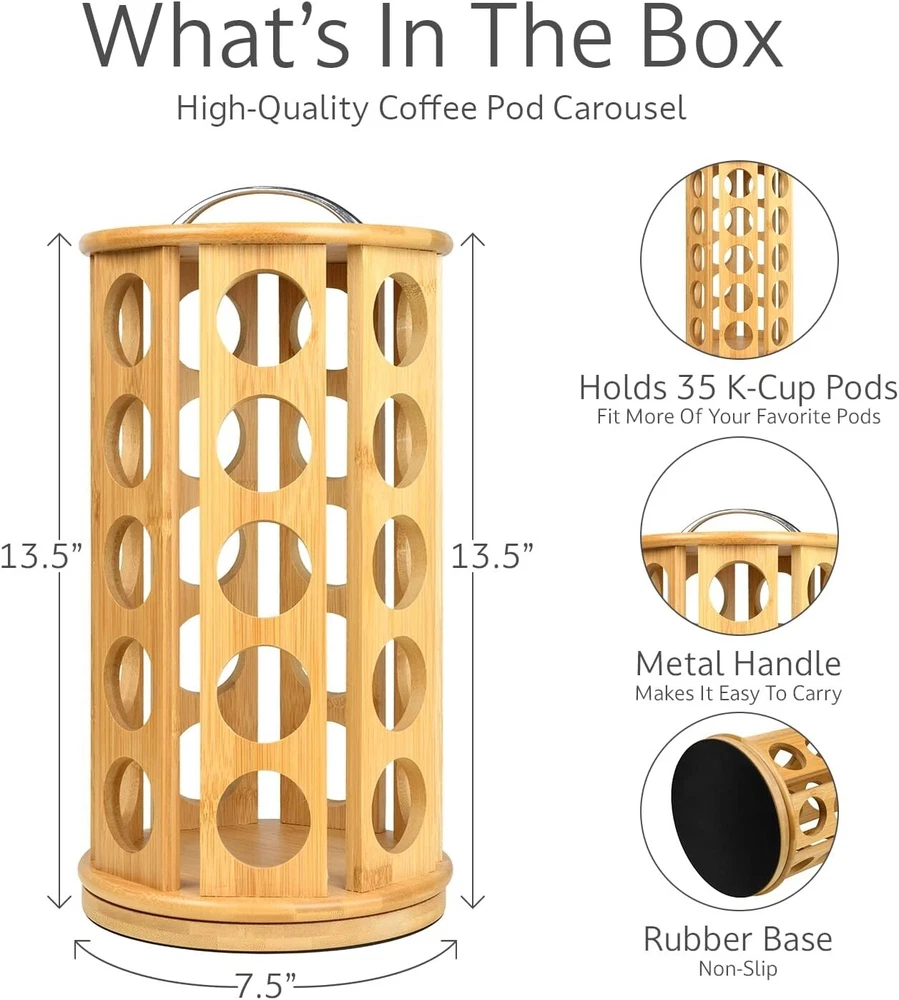 Eco-Friendly Bamboo Coffee Pod Organizer, Holds 35 K-Cups - Stylish & Functional ‹ › ‹ › ‹ › ‹ › ‹ › ‹ › ‹ › ‹ › ‹ › Eco-Friendly Bamboo Coffee Pod Organizer - Holds 35 K-Cups - Stylish & Functional Features: Large Capacity: Organizes up to 35 K-Cup compatible coffee pods, ensuring your favorites are always at your fingertips. Easy Access: Enjoy effortless selection with a 360-degree rotating design. Soft EVA foam at the base provides stability, preventing sliding. Space Saving: Vertical and compact, this organizer is perfectly designed to complement any coffee maker. Dimensions: 13.5 inches in height and 7.5 inches in diameter . Durable Construction: Made from high-quality bamboo, this pod holder is built to last. Angled slots securely cradle your pods, preventing spills onto your counter. K-Cup Compatible: Perfect for coffee, tea, hot cocoa, and more—this carousel keeps your beloved beverages organized and ready for brewing. Benefits: Eco-friendly bamboo construction adds a touch of organic elegance to your kitchen. Maintain a clutter-free counter top while showcasing your beloved coffee pods. Quick and easy access to your favorite brews enhances your morning routine. Durable design minimizes the risk of breakage, ensuring long-term enjoyment. Why choose our Bamboo Coffee Pod Organizer? Transform your coffee station with our Eco-Friendly Bamboo Coffee Pod Organizer. Its elegant design and impressive capacity not only elevate your kitchen aesthetic but also ensure that your morning brew is just a spin away. Say goodbye to clutter and hello to convenience as you enjoy the simplicity of one-touch access to all your K-Cup pods. Embrace sustainable elegance with this stylish organizer—order yours today and indulge in the luxury of a perfectly curated coffee experience! Shipping Free & Fast Shipping - We offer free shipping to most of the USA with a normal delivery time of 3-7 days. However, due to the current situation, additional delivery time (up to 3 weeks) may be required for some items. Alternative Carriers - We may use alternative carriers (e.g. USPS, FedEx, UPS, etc.) to ensure your package arrives safely and on time. Due to the use of multiple carriers, we are unable to provide a tracking number automatically. Handling Time - Orders are processed and shipped within 1-2 business days of receiving cleared payment. Shipping Restrictions - Shipping to Alaska, Hawaii, Puerto Rico, Guam, and other US territories may incur shipping charges or delivery restrictions. Please contact us before ordering, or your order can be refunded/cancelled. State Restrictions - There may be restrictions based on your state of purchase. For example, certain items may not be shipped to California due to state regulations. Contact for Tracking Updates - If you require tracking updates or have any concerns about the delivery of your order, please feel free to contact us, and we will be happy to assist you. Return 30-Day Hassle-Free Returns - We want you to be completely satisfied with your purchase. If you are not, you can return the item within 30 days of receiving it for a full refund or exchange. Easy Return Process - To start a return, simply contact us and we will provide you with a prepaid return shipping label and detailed instructions. Restocking Fee - There are no restocking fees for returns. However, the buyer is responsible for return shipping costs if the return is not due to a seller's error. Refund Processing Time - Refunds will be processed within 5 business days of receiving the returned item in its original condition. Payment We accept all major credit cards, PayPal, and Apple Pay for your convenience. Your payment information is secure and encrypted to ensure a safe and seamless transaction. Please complete your payment within 3 days of purchase to avoid any delays in shipping. Feedback Your feedback is extremely important to us. We strive to provide the best products and customer service possible. If you are satisfied with your purchase, please take a moment to leave us a positive review. If you have any concerns or issues with your order, please contact us before leaving negative feedback. We are committed to resolving any problems and ensuring your satisfaction. Contact Us If you have any questions or concerns, please feel free to reach out to our customer support team. You can contact us through the eBay messaging system. We are available Monday to Friday, 9:00 am to 5:00 pm EST, and we will do our best to respond to your inquiry within 24 hours. Buy it now and enjoy a pleasant shopping experience! UPC: Not Set Unit Quantity: 2.83 lbs Material: Bamboo Features: Rotating Base,Easy Access,Space Saving,Durable Construction Mounting: Free Standing Set Includes: Not Set Department: Unisex Brand: Unbranded Item Height: K Cup Organizer Item Length: K Cup Organizer Item Width: K Cup Organizer Type: K Cup Holder Color: Natural Size: Large Number of Shelves: 1 Number of Compartments: 1 Shape: Round Number of Tiers: 1 MPN: Not Set Style: Modern Country/Region of Manufacture: Not Set Rack Type: Carousel/ Revolving Wood Tone: Bamboo Item Depth: 7.5 in Item Diameter: 7.5 in Capacity: 35 pods Capsule/Pod Capacity: 35 Item Weight: 2.83 lbs Model: Not Set Unit Type: lb Personalize: Not Set