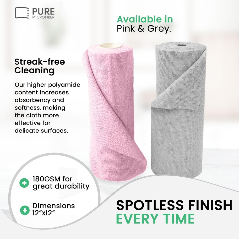 Reusable Paper Towel - Microfiber Cleaning Cloth Roll, Lint-Free, Pink Product Details Package Dimensions : 11.97 x 4.65 x 4.61 inches; 2.01 Pounds Item model number : 50pack Manufacturer : Pure Microfiber Country of Origin : China Brand: Pure Microfiber Unit Count: 50.0 Count Sheet Count: 50 Ply Rating: 180 gsm (grams per square meter) Special Feature: Super Absorbent, Odor Resistant, Lint Free 80% polyester, 20% polyamide [Lint-Free and Non-Abrasive]: Our microfiber cleaning cloth roll is designed to be lint-free and nonabrasive. Say goodbye to scratches and debris with our ultra-fine microfiber material. [Highly Absorbent and Durable]: These are highly absorbent and durable, ensuring they can handle even the toughest cleaning tasks. Ideal for both dry and wet cleaning, it offers exceptional performance. [Professional Quality]: Crafted with high-quality materials at 80% polyester and 20% polyamide. These towels are perfect for opticians, and photographers. Trust our towels to deliver a streak-free and spotless finish. [Eco-Friendly and Reusable]: Switch to our towel roll and reduce waste. These microfiber towels are washable and reusable, making them eco-friendly for households who care about the environment. [Multi-Purpose Cleaning Solution]: These are versatile for various cleaning tasks. Whether you need kitchen cleaning cloths or reusable microfiber towels, our microfibre cleaning cloths have you covered.
