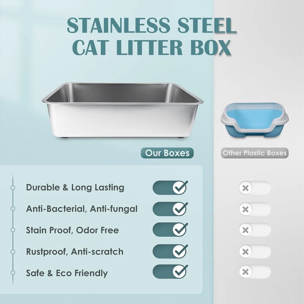 Eco-Friendly Stainless Steel Litter Box for Kittens and Cats – Easy Odor Control ‹ › ‹ › ‹ › ‹ › ‹ › ‹ › ‹ › ‹ › ‹ › ‹ › Eco-Friendly Stainless Steel Litter Box for Kittens and Cats Introducing the ultimate in comfort and hygiene for your beloved feline companions. Our Eco-Friendly Stainless Steel Litter Box is designed to provide an odor-free, safe, and easy-to-clean environment for both kittens and small cats. Product Features: Made from high-quality, durable stainless steel that is rustproof and scratchproof. Dimensions: 17.5" Length x 13.5" Width x 6" Height (45cm x 35cm x 15cm), perfect for kittens and small cats weighing 6.5 to 9 pounds. High sides to keep litter from scattering and reduce clean-up efforts. Non-stick surface for effortless cleaning; litter doesn’t stick to the bottom. Rubber padded feet on each corner for a non-slip experience and protection of your floors from scratches. Rounded corners and no sharp edges for safe handling. Benefits: Eco-friendly and long-lasting construction. Easy to maintain an odor-free environment. Suitable not only for cats, but also for small pets like rabbits and hamsters. Simple design allows for easy lifting and safety for both you and your pets. Creates a happy space for your pets, leading to a happier life for you. Why Choose Our Eco-Friendly Stainless Steel Litter Box? Make the switch to a cleaner, more sustainable, and stylish option for your kitty. With its durable design and easy-to-clean properties, our litter box is a fantastic investment for your pet’s well-being. Each litter box ensures minimal mess, quick cleaning, and maximum comfort for your furry friends. Order yours today and join the revolution of pet care that prioritizes health, comfort, and sustainability! Shipping Free & Fast Shipping - We offer free shipping to most of the USA with a normal delivery time of 3-7 days. However, due to the current situation, additional delivery time (up to 3 weeks) may be required for some items. Alternative Carriers - We may use alternative carriers (e.g. USPS, FedEx, UPS, etc.) to ensure your package arrives safely and on time. Due to the use of multiple carriers, we are unable to provide a tracking number automatically. Handling Time - Orders are processed and shipped within 1-2 business days of receiving cleared payment. Shipping Restrictions - Shipping to Alaska, Hawaii, Puerto Rico, Guam, and other US territories may incur shipping charges or delivery restrictions. Please contact us before ordering, or your order can be refunded/cancelled. State Restrictions - There may be restrictions based on your state of purchase. For example, certain items may not be shipped to California due to state regulations. Contact for Tracking Updates - If you require tracking updates or have any concerns about the delivery of your order, please feel free to contact us, and we will be happy to assist you. Return 30-Day Hassle-Free Returns - We want you to be completely satisfied with your purchase. If you are not, you can return the item within 30 days of receiving it for a full refund or exchange. Easy Return Process - To start a return, simply contact us and we will provide you with a prepaid return shipping label and detailed instructions. Restocking Fee - There are no restocking fees for returns. However, the buyer is responsible for return shipping costs if the return is not due to a seller's error. Refund Processing Time - Refunds will be processed within 5 business days of receiving the returned item in its condition. Payment We accept all major credit cards, PayPal, and Apple Pay for your convenience. Your payment information is secure and encrypted to ensure a safe and seamless transaction. Please complete your payment within 3 days of purchase to avoid any delays in shipping. Feedback Your feedback is extremely important to us. We strive to provide the best products and customer service possible. If you are satisfied with your purchase, please take a moment to leave us a positive review. If you have any concerns or issues with your order, please contact us before leaving negative feedback. We are committed to resolving any problems and ensuring your satisfaction. Contact Us If you have any questions or concerns, please feel free to out to our customer support team. You can contact us through the eBay messaging system. We are available Monday to Friday, 9:00 am to 5:00 pm EST, and we will do our best to respond to your inquiry within 24 hours. Buy it now and enjoy a pleasant shopping experience! Unit Quantity: 1 count Type: Litter Box