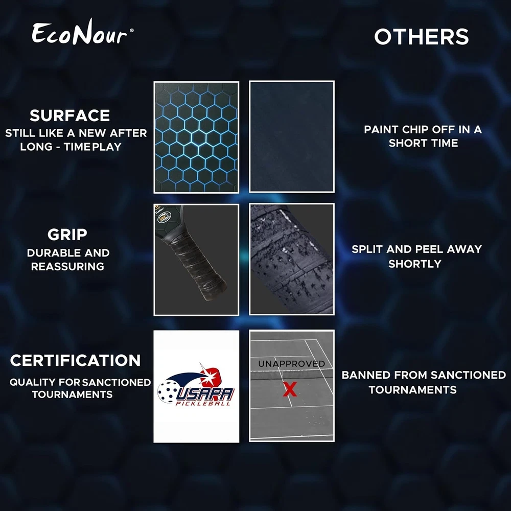 SUPREME STRIKING DOMINANCE: Unleash precision and power with EcoNour pickleball paddles expanded sweet spot, ensuring mastery on the court. Elevate your game, control every shot, and reign supreme with unrivaled battle dominance. RAPID RESPONSE TECHNOLOGY: Ignite your play with Rapid Response Fiberglass technology, our pickleball set delivering lightning-fast responses, effortless swings, and unparalleled precision control. Experience a new era of fiberglass pickleball paddles mastery. ULTIMATE COMFORT, ZERO SWEAT : Conquer the heat with sweat-resistant and cushioned comfort. Our pickle ball keeps you cool under pressure, ensuring a comfortable grip for extended play. Your victories, your way, every time. ARMORED DURABILITY : Fortify your game with our carbon fiber pickleball paddle, durable edge armor, enhancing paddle resilience and longevity. Stand strong against intense play, secure in the knowledge that your paddle is built to withstand the fiercest battles. VERSATILITY UNLEASHED: Whether you're a pro, an intermediate enthusiast, or just starting, this pickleball racket caters to all skill levels. Experience the pinnacle of performance, regardless of your playing expertise. COMPLETE PERFORMANCE PACKAGE: Unleash your full potential with an all-in-one set. Includes a pickleball paddles set of 2, storage bag, 2 sweat towels, and 4 balls (2 for indoor, 2 for outdoor play). Elevate your pickleball experience with unmatched convenience and style!