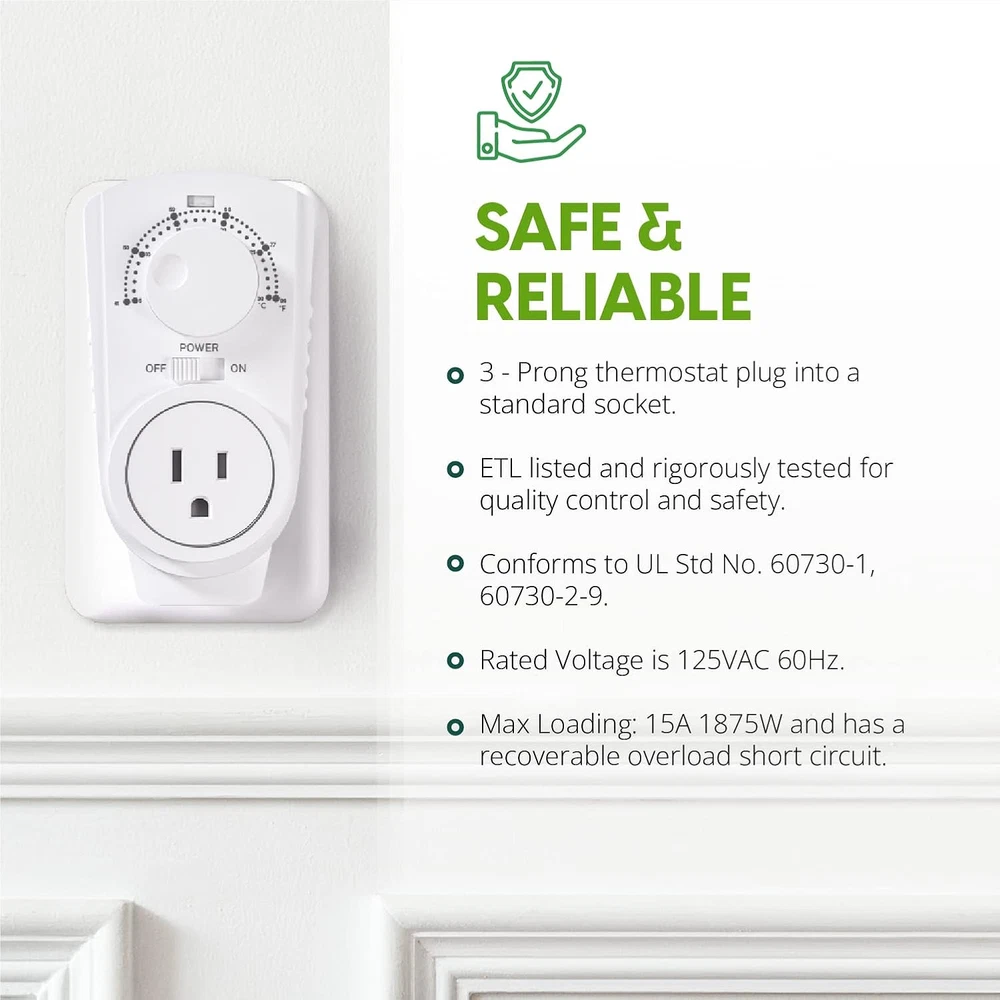 EASY TO OPERATE: Just plug in this adjustable thermostat, select heat / cool mode with the user-friendly switch and it will automatically turn on or off your heating or cooling devices through your preset target temperature. EFFORTLESS TEMPERATURE SETUP: This non-digital plugin thermostat comes with an adjustable temperature dial and the current temperature is displayed on the center for easy reference. Temperature control range is 41-86°F. SAVES YOU ON YOUR HOME ENERGY BILLS: You’re always a winner with this heating & cooling thermostat. It’s energy efficient while maintains a consistent ambient room temperature. VERSATILE USES: Suitable for most portable space heaters, air coolers, and circulating fans. Can also be used for refrigeration, fermentation, greenhouse fan and designed to suit almost any application you can imagine. SAFE & RELIABLE: This 3-Prong thermostat plug into a standard socket is ETL listed and rigorously tested for quality control and safety. Conforms to UL Std No. 60730-1, 60730-2-9. Rated Voltage is 125VAC 60Hz, Max Loading: 15A 1875W and has a recoverable overload short circuit. Dimensions: 5” x 2.5” x 2.5” Product Description