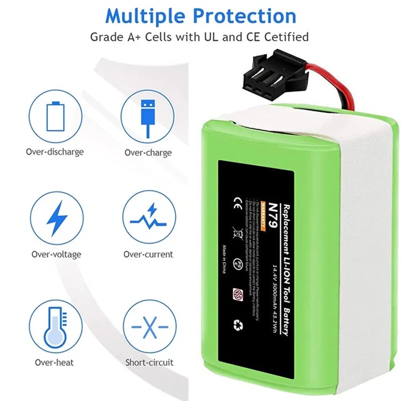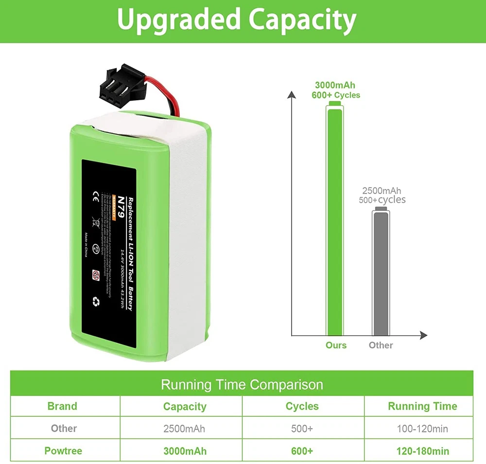 Product Description About this item Lithium-ion š³ćBattery TypećBattery type: Li-ion battery,Voltage: 14.4V, Capacity: Upgraded 3000mAhļ¼No Fake High Label Capacityļ¼. No memory effect, no pollution, and low self-discharge, can be charged or discharged as needed without loss of capacity. 100% compatible with original charger. š³ćCompatibilityćCompatible with Ecovacs Deebot N79S, Deebot N79, Deebot DN622, Eufy RoboVac 11, RoboVac 11S, RoboVac 11S MAX, RoboVac 12, RoboVac 15T, RoboVac 15C, RoboVac 15C MAX, RoboVac 30, RoboVac 30 MAX, RoboVac 30C, RoboVac 35C, G10 Hybrid, G30, G30 Edge, G30 Hybrid, G30 Verge. See more compatible model in description. š³ć600+ Recharge CyclesćPOWTREE 3.0Ah Ecovcas battery replacement can be recharged up to 600+ cycles of use. No memory effect, low self-discharge rate and long-lasting battery life š³ćHigh QualityćBattery uses the highest quality cells, safe with rapid-charge technology while providing overcharge and over discharge multiple protection to increase the life of the battery. Reliable safeguard features with the protection for short-circuit, output over-voltage, over-heat and output over-current. Perfect Battery Management System, high-end protection IC. Power Battery to support max. 8A discharge. Compatible with Ecovacs N79S, 500, N79, N79SE, N79W, DN622, DN622.11 Robot Vacuum Cleaners. 14.4V 3000mAh Li-ion rechargeable replacement battery makes vacuum lasting around 100 minutes per charge. Easy to install, local sale support, 24/7 response to online messages, 12 months warranty. Futures : 3000mAh High Capacity Battery Li-ion Rechargeable battery, convenient to use. And it has no memory effect. Can be charged or discharged as needed without loss of capacity. Same size & function as original battery, don't worry damaging your robot. Quick charge and easy to install. ISO9001, RoHS, and CE certified NO FAKE HIGH "LABEL" CAPACITY High Performance Li-ion Battery with 600+ Recharge Cycles With 3000mAh capacity, the battery can last 120-180 minutes after being fully charged (Depending on use & setting), like the original. Built-in multiple protections against overload, overvoltage, overcurrent, short circuit and internal overheating, ensure effective and safe cleaning in your home. Imported high density lithium battery, higher cost, better performance, more durable(can be recharged 600+ cycles) Compatible With:(use"Ctrl+F" to find your own PN & Model) Compatible for Deebot Series: Ecovacs Deebot N79, Deebot N79S, Deebot 600, Deebot 601, Deebot DN622, Deebot 661 Compatible for RoboVac Series:Eufy RoboVac 11 (T2102), RoboVac 11S (T2108), 11S MAX (T2126), RoboVac 12, 15T, 15C (T2120), 15C MAX, 25C Max, 30, 30C, 30 MAX, 35C, G10 Hybrid, G30, G30 Edge, G30 Hybrid, G30 Verge Compatible for :for Conga 990, Tesvor x500 NOT Compatible with: NOT for Eufy RoboVac 11+, iLife A4/A4S/A4S pro/A6/A9/V7/V7S/V7S pro Compatible Models For Eufy RoboVac 11, RoboVac 11S, RoboVac 11S MAX For Eufy RoboVac 12, RoboVac 15C, RoboVac 15C MAX, RoboVac 15T For Eufy RoboVac 30, RoboVac 30C, RoboVac 30 MAX, RoboVac 35C For Ecovacs Deebot N79,Ecovacs Deebot N79S,Ecovacs Deebot DN622 Ecovacs Deebot N79, Deebot N79S, Deebot DN622, Deebot DN621, Eufy RoboVac 11, RoboVac 11S, RoboVac 11S MAX, RoboVac 15T, RoboVac 30, RoboVac 30C Max, RoboVac 15C, RoboVac 15C MAX, RoboVac 12, RoboVac 35C. For Eufy RoboVac 11, RoboVac 11S, RoboVac 11S MAX For Eufy RoboVac 12, RoboVac 15C, RoboVac 15C MAX, RoboVac 15T For Eufy RoboVac 30, RoboVac 30C, RoboVac 30 MAX, RoboVac 35C For Ecovacs Deebot N79,Ecovacs Deebot N79S,Ecovacs Deebot DN622 For Eufy RoboVac 11, RoboVac 11S, RoboVac 11S MAX For Eufy RoboVac 12, RoboVac 15C, RoboVac 15C MAX, RoboVac 15T For Eufy RoboVac 30, RoboVac 30C, RoboVac 30 MAX, RoboVac 35C For Ecovacs Deebot N79S, 500, N79, N79SE, N79W, DN622, DN622 About Us Welcome to our store! We are a professional worldwide wholesale company. High product quality, reasonable prices, excellent customer service and a reliable credit standing is our tenet.If you like our products, please add my eBay shop to your "My Favorites" list. All the products we are selling include factory warranty , donāt cover items that have been abused, burned and damaged in any form. Payment We accpet payment via PayPal , E-wallet , some Credit Card , Direct Debit and Other specific payment methods. Import duties,taxes and charge are not included in the item's price or shipping cost.These charges are the buyer's responsibility. Please check with your country's customs office to determine what these additional costs will be prior to bidding or buying. Insurance is included in the Shipping & Handling costs paid. Shipping Items are generally shipped out in 1-3 business day after your payment has been cleared (Sat. & Sun. excluded.) Orders from the United States Warehouse will be shipped out via USPS or UPS. The shipment usually takes 3-7 business days(Saturday and Sunday excluded), if you need the item urgently, please contact us for detail before purchasing. Local pick up is not available. Orders from China will be shipped via Belgian Post or Post NL.The shipment will take 15-35 working days,please contact us if you didn't get the parcel for a long time. We do not ship to APO, FPO, Alaska, Hawaii and Puerto Rico addresses, and we are unable to ship to PO BOX for this item. Please provide your psychical address. Returns You have 60 days to return it from the date it was received. All returned items must be in the original package and you must provide us with the shipping tracking number,specific reason for the return and your ebay ID. We will refund your full winning bid amount , upon receipt of the item in its original condition and package with all components and accessories included. Contact Us Dear buyers,we appreciate your business, if you are satisfied with our service , please leave us a Positive feedback and rate the details of the transaction (Detailed Seller Ratings) with a " Pefect Stars ". We ai