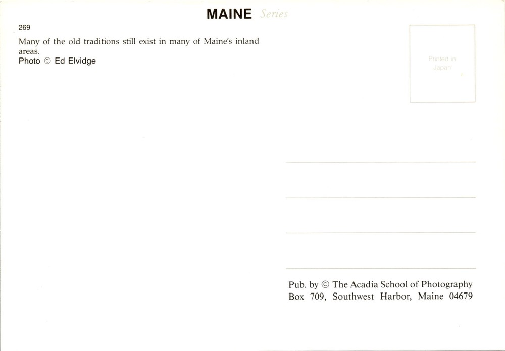 MAKE AN OFFER. THE MORE YOU BUY THE BETTER DEAL I WILL ACCEPT This postcard is part of a series featuring Maine, a state known for its rich history and traditions. The front of the postcard mentions that many old traditions still exist in Maine's inland areas. The photo on the postcard is credited to Ed Elvidge, and the postcard was printed in Japan.
