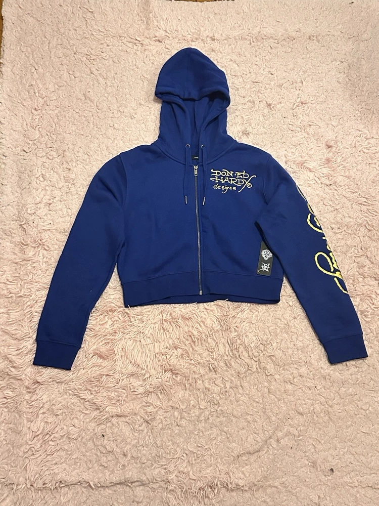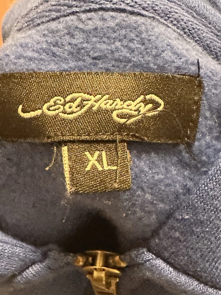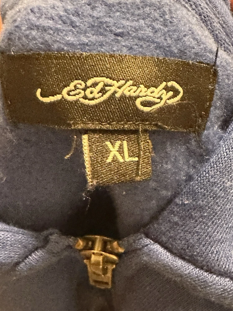 Accents: Logo Color: Blue Style: Full Zip Sleeve Length: Long Sleeve Pattern: Solid Theme: Modern Season: Winter, Fall Features: Hooded, Graphic Print, Full Zip Size: XL Fit: Regular Size Type: Regular Department: Women Type: Hoodie Occasion: Activewear Material: Cotton Brand: Ed Hardy Closure: Zip Product Line: Ed Hardy