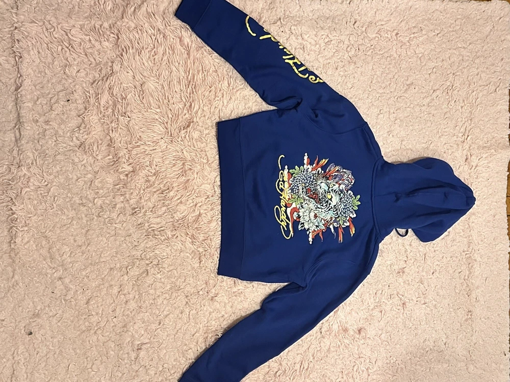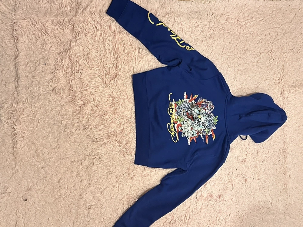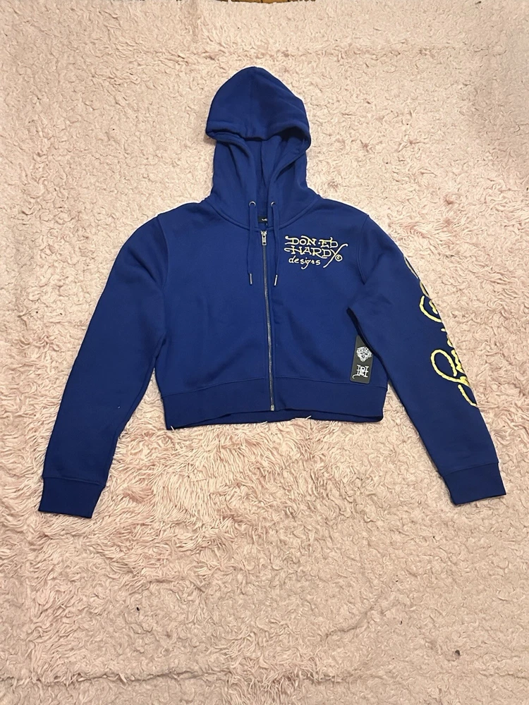 Elevate your activewear game with this Ed Hardy blue graphic cropped hoodie. The full zip hoodie features a solid pattern with a logo accent, perfect for a modern look. Made of cotton material, the hoodie comes in size XL with a regular fit, making it comfortable for all-day wear. Ideal for winter and fall, the hoodie is designed with a graphic print, hooded feature, and full zip closure for added warmth and style. Its product line is a testament to its quality and style, making it a must-have for any fashion-conscious woman. Get your hands on this Ed Hardy hoodie and make a statement wherever you go!