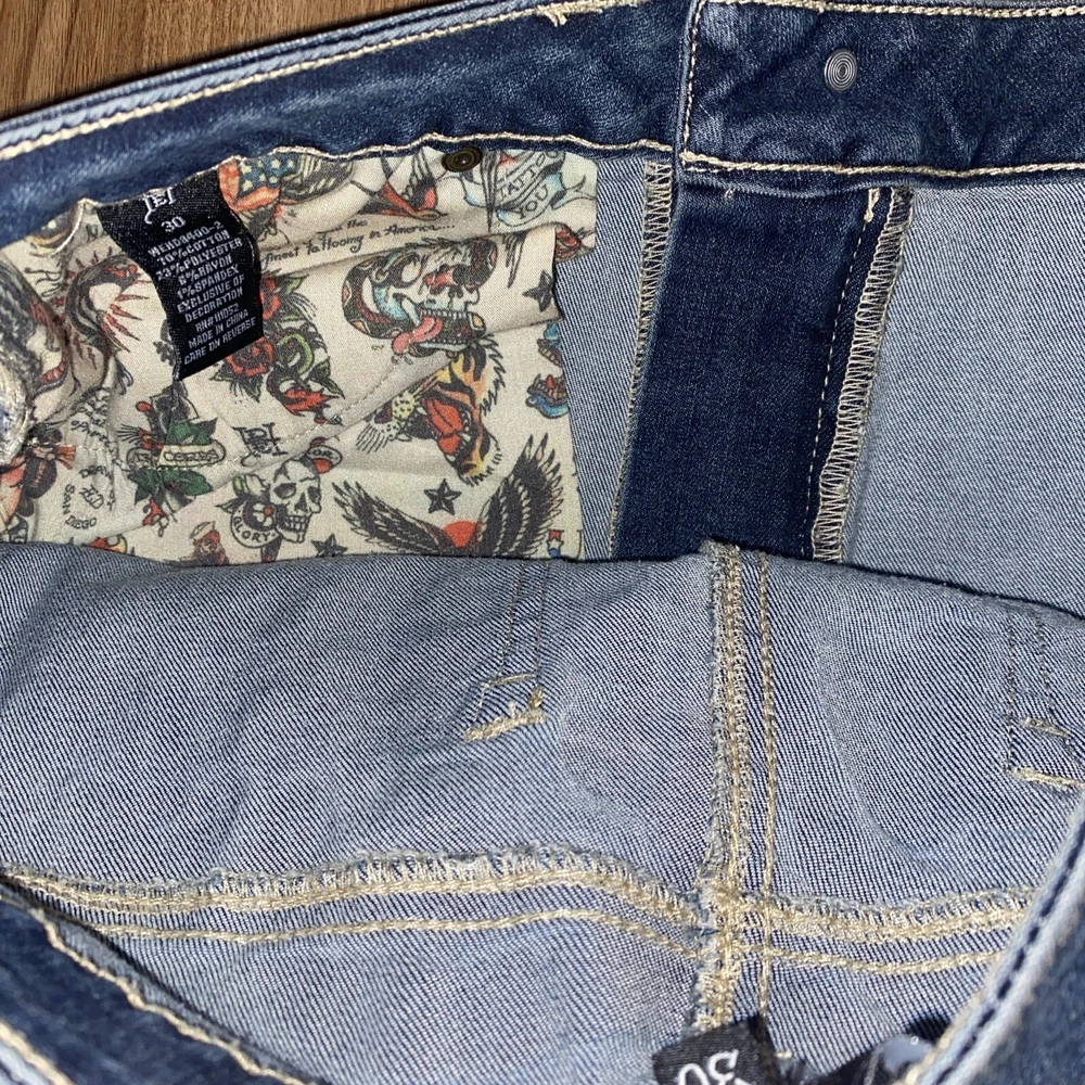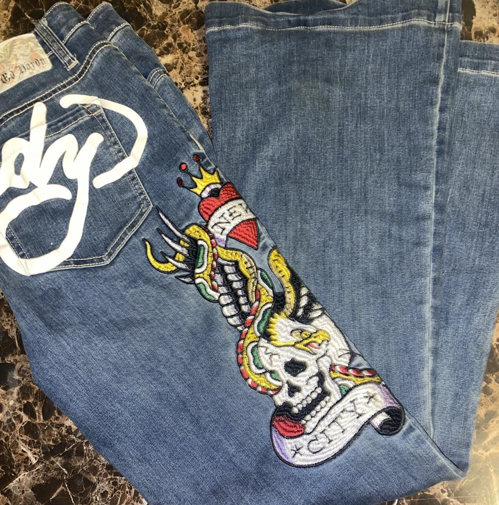 Ed Hardy Jeans Adult 30 Blue Denim New York City Eagle Embroidered Mens. These Ed Hardy jeans are perfect for any man who loves to show off his unique style. The bold embroidery of the New York City Eagle on the back of the jeans makes them a statement piece. The wide-leg style and denim fabric make them comfortable and versatile for any occasion. These jeans are perfect for a casual day out or a night on the town. The regular size type and 32-inch inseam ensure a great fit for any man. Add these jeans to your wardrobe and show off your love for Ed Hardy and New York City. Sold as is in pictures 30/32