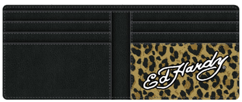 Officially licensed 8 credit card slots Dimensions: 5" W x 4" H x 1" D Material: Polyurethane, polyester Care: Spot clean Imported Looking for accessories that are just as tatted up as you are? Ink out your wardrobe with this officially licensed Ed Hardy Leopard Print Skull Bifold Wallet! Its sleek exterior, stud accents, and iconic Ed Hardy illustrations will turn heads wherever you go.