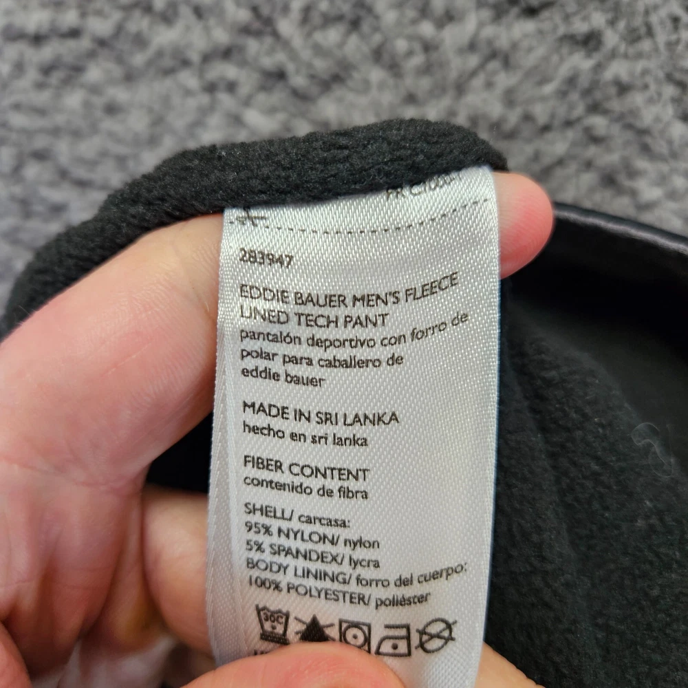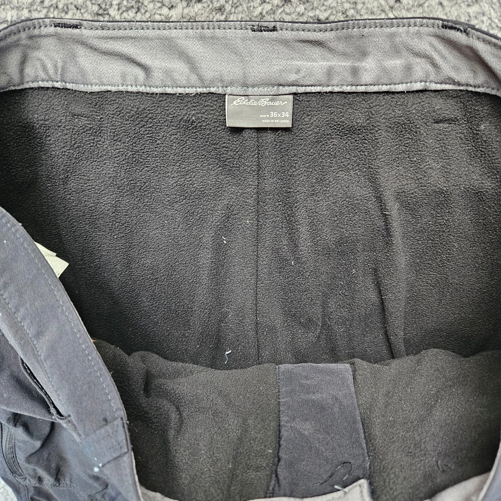 gtin13: Does not apply UPC: Does not apply Model: Eddie Bauer Fleece Lined Tech Pant Material: 95% Nylon, 5% Spandex Size: 36 Brand: Eddie Bauer Style: Cargo Department: Men Product Line: Eddie Bauer Fleece Lined Tech Pant Closure: Button, Zip Garment Care: Machine Washable Waist Size: 36 in Season: Winter Occasion: Casual, Workwear Color: Black Inseam: 33 in Front Type: Flat Front Type: Pants Size Type: Regular Pattern: Solid Rise: Mid (10-12 in) Features: Lined Fit: Regular Leg Style: Straight