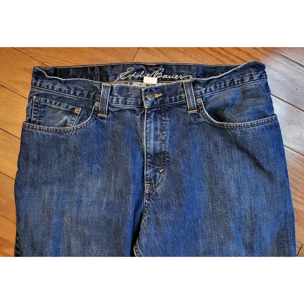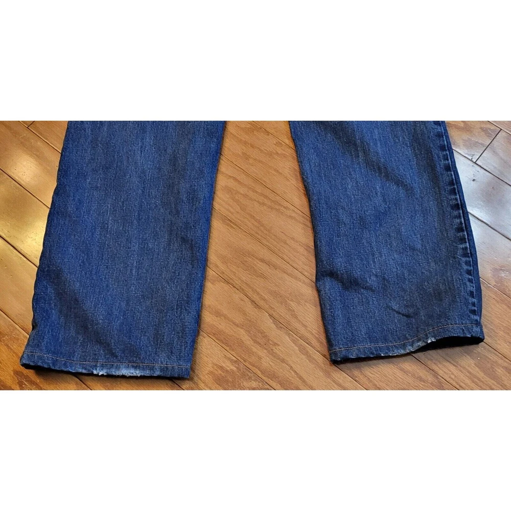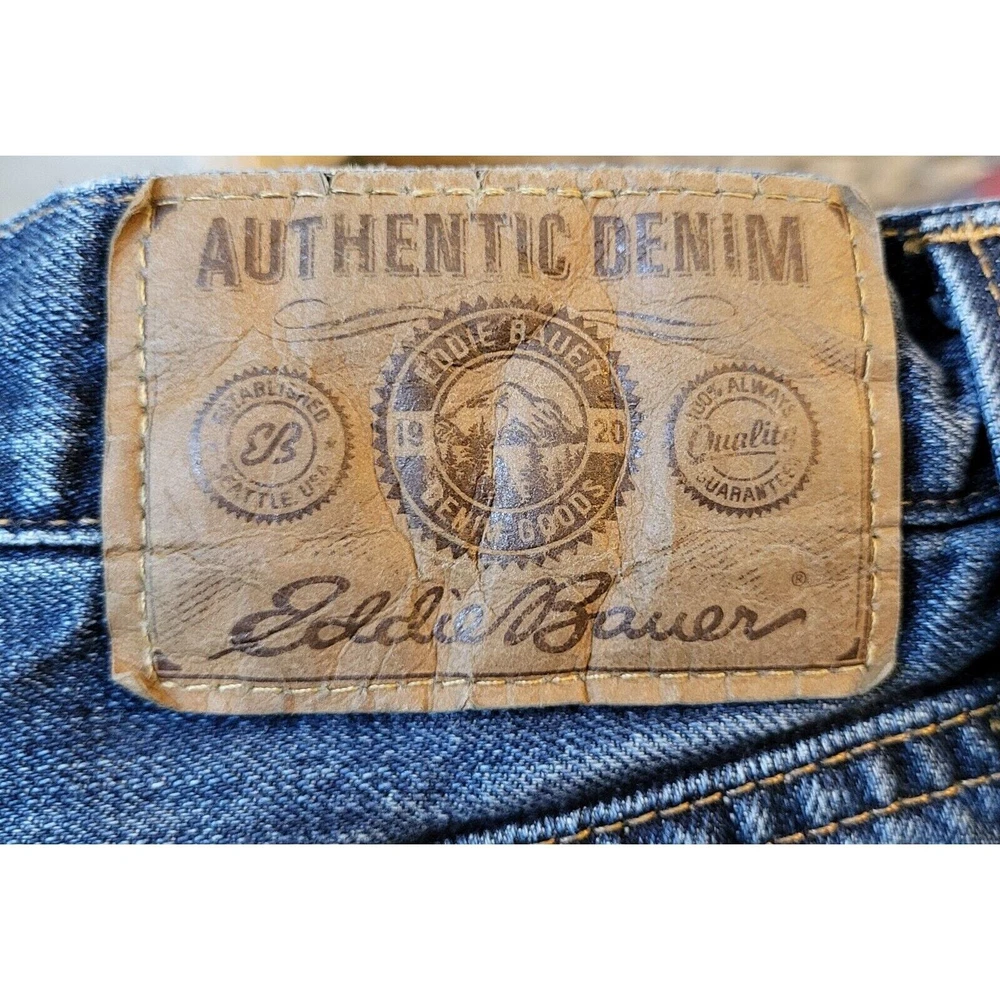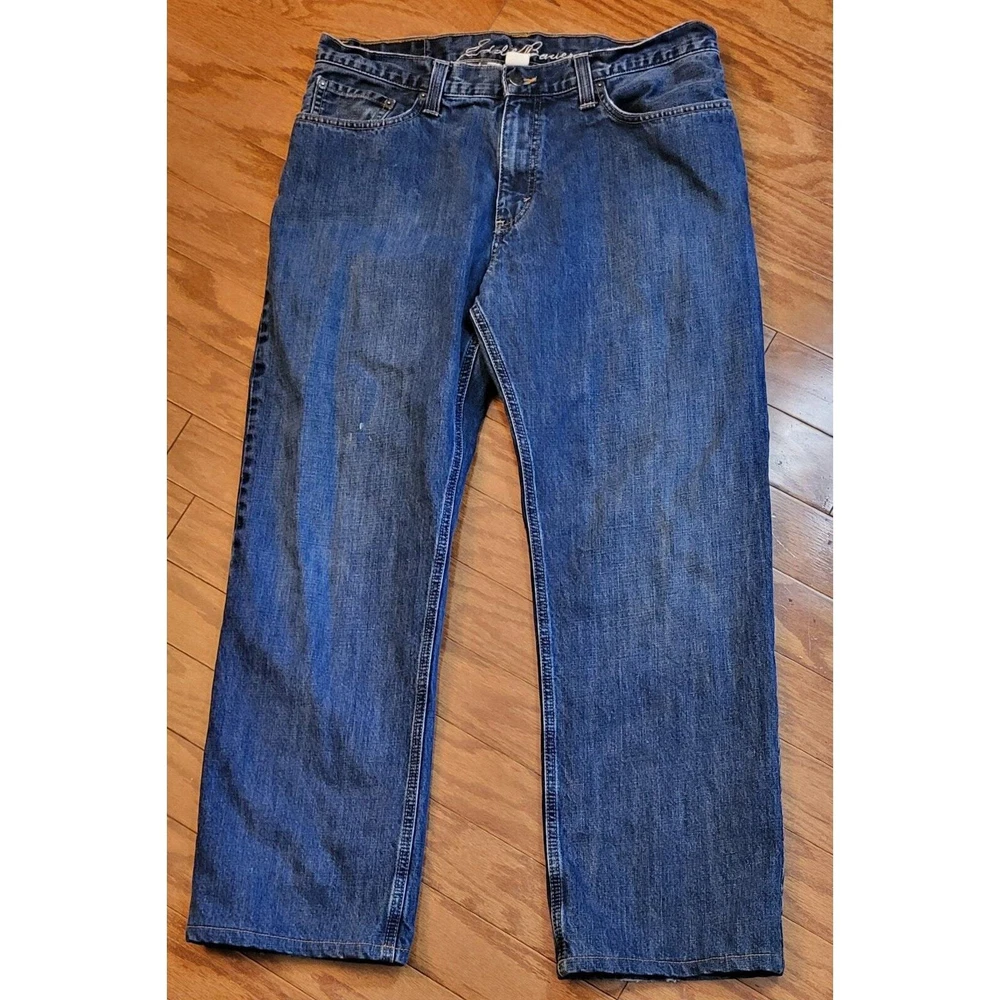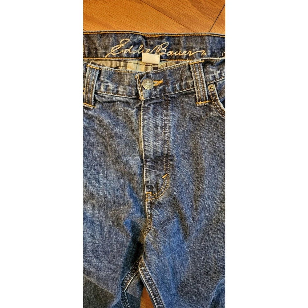 Upgrade your winter wardrobe with these Men's Eddie Bauer Travex flannel-lined denim jeans. The blue solid pattern and 5-pocket design give a classic look, while the high-rise waist and relaxed fit provide ample comfort. The 100% cotton material ensures durability, and the medium fabric wash adds to the vintage aesthetic. Featuring zip closure and belt loops, these jeans also have button, zipper, and logo accents. Suitable for outdoor activities in winter, fall, and spring, these jeans are a must-have for men who appreciate style and warmth. Get your hands on these quality jeans, perfect for everyday wear. Waist: 35 Inseam: 29 Excellent preowned condition. Zipper and button function properly. The hem is slightly frayed as shown in the pictures. Grab them today for your wardrobe!