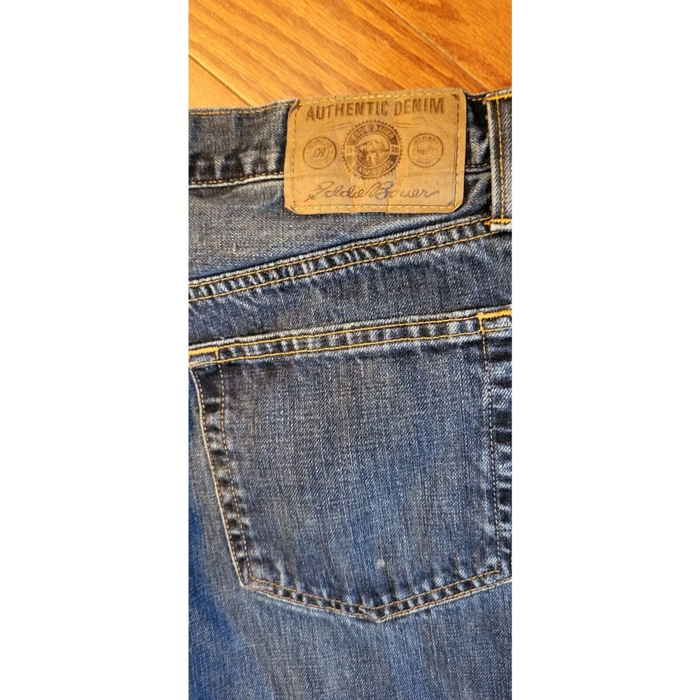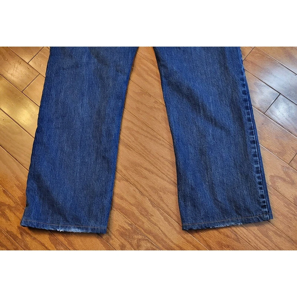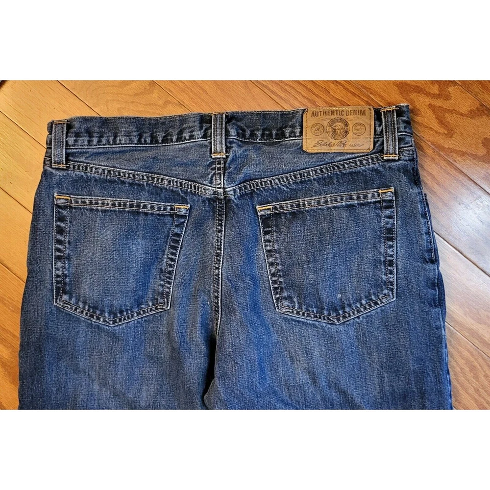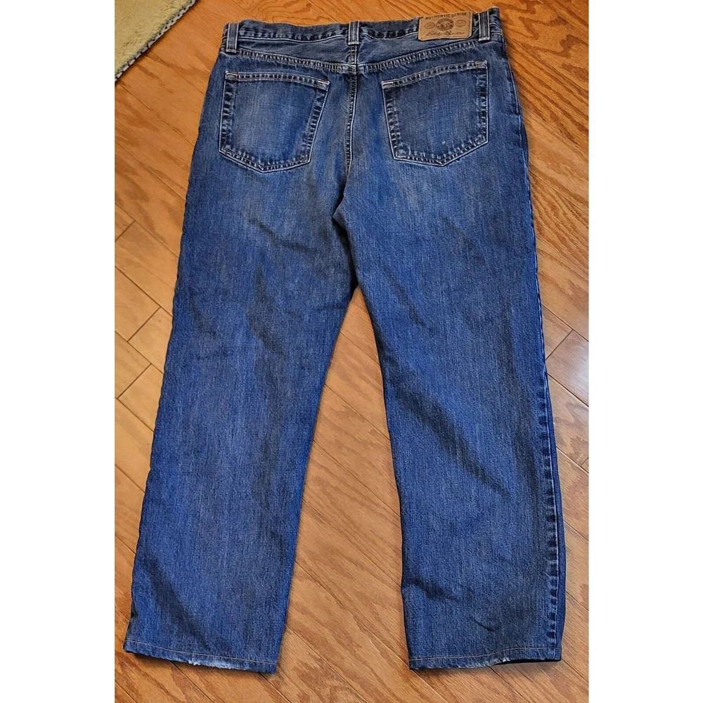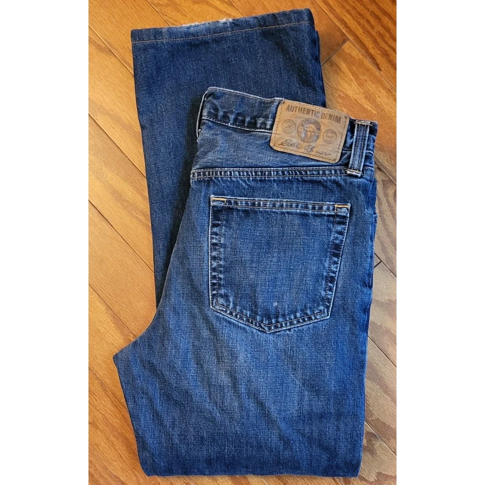 Upgrade your winter wardrobe with these Men's Eddie Bauer Travex flannel-lined denim jeans. The blue solid pattern and 5-pocket design give a classic look, while the high-rise waist and relaxed fit provide ample comfort. The 100% cotton material ensures durability, and the medium fabric wash adds to the vintage aesthetic. Featuring zip closure and belt loops, these jeans also have button, zipper, and logo accents. Suitable for outdoor activities in winter, fall, and spring, these jeans are a must-have for men who appreciate style and warmth. Get your hands on these quality jeans, perfect for everyday wear. Waist: 35 Inseam: 29 Excellent preowned condition. Zipper and button function properly. The hem is slightly frayed as shown in the pictures. Grab them today for your wardrobe!