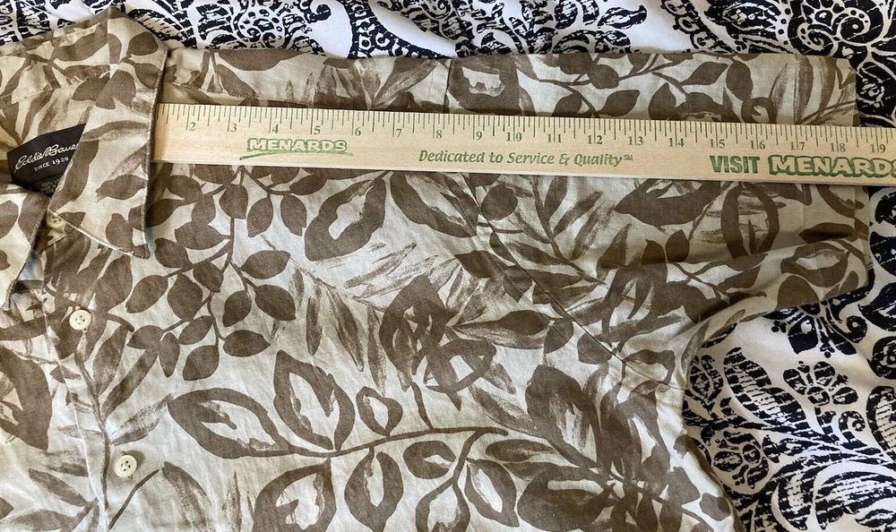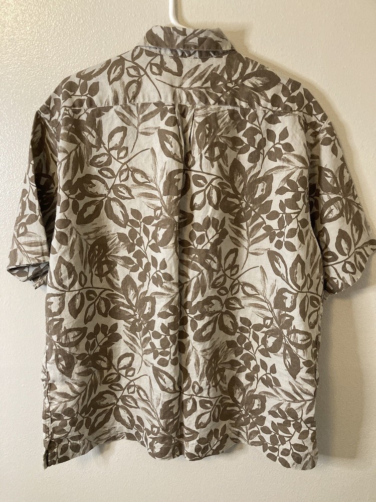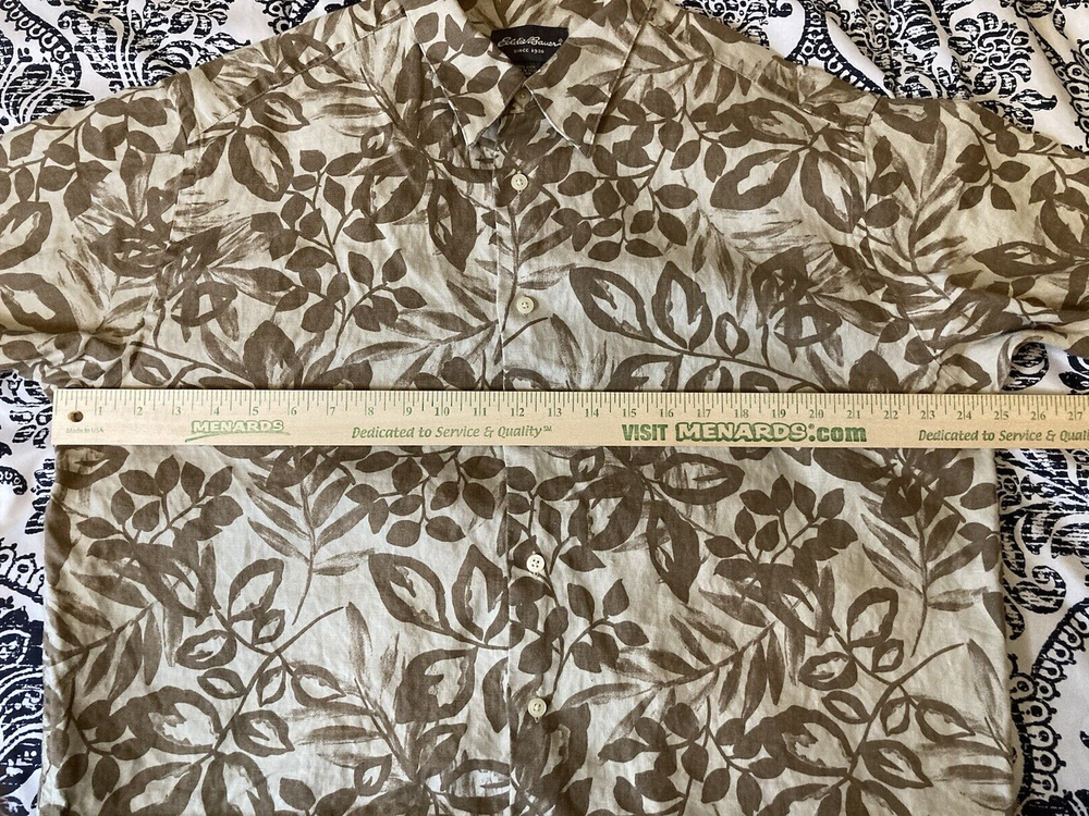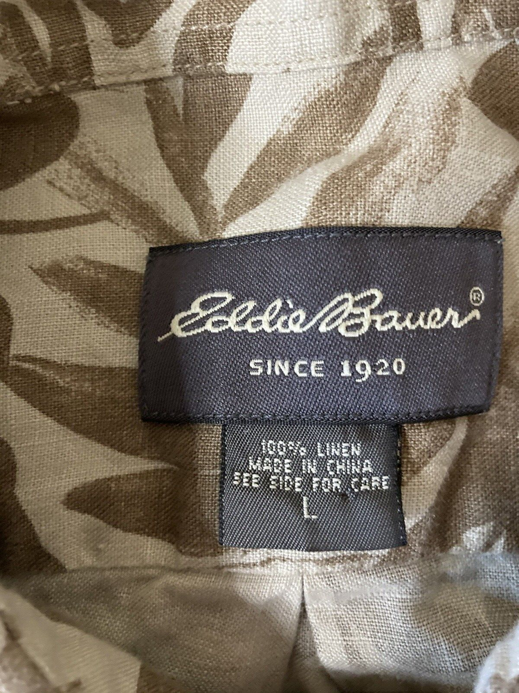 This is a men's Hawaiian shirt from Eddie Bauer, made of 100% linen in brown color with a floral pattern. It has a collared neckline and short sleeves, with a button-up closure and a regular fit. The shirt is lightweight, breathable, and suitable for all seasons. It is machine washable and easy to care for. The shirt is perfect for travel, parties, cocktails, casual wear, and workwear. The shirt is not handmade and was manufactured in China.