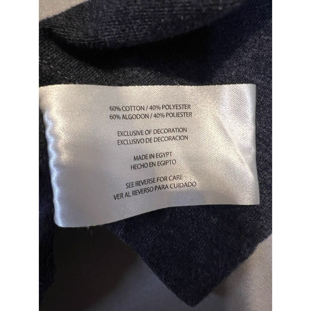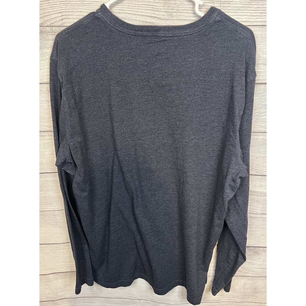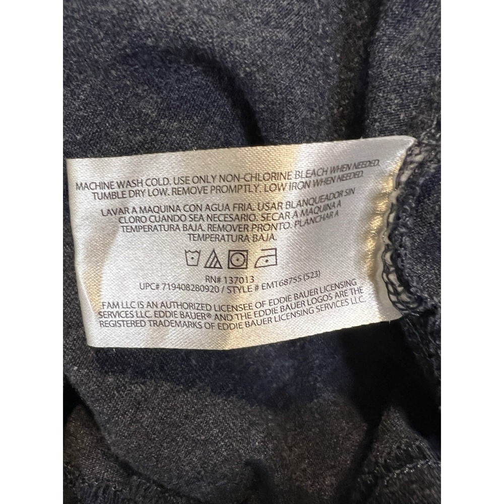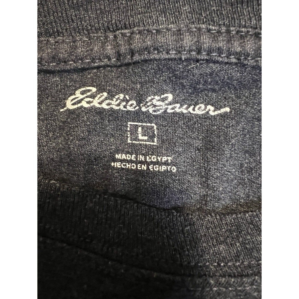 Excellent condition. Soft heather navy Eddie Bauer men's long sleeve T-shirt featuring a white forest and mountain graphic with crescent moon print. Comfortable cotton-blend material (60% cotton / 40% polyester). Made in Egypt. Length: 28 inches Width: 23 inches Sleeve: 24.5 inches