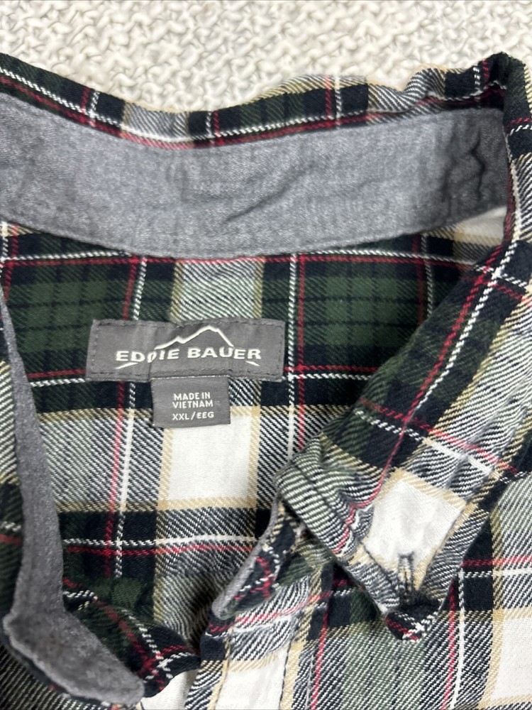 Eddie Bauer Men's Size XxLarge Black Brown Plaid Flannel Button Down Shirt. Condition is Pre-owned. Shipped with USPS Ground Advantage.
