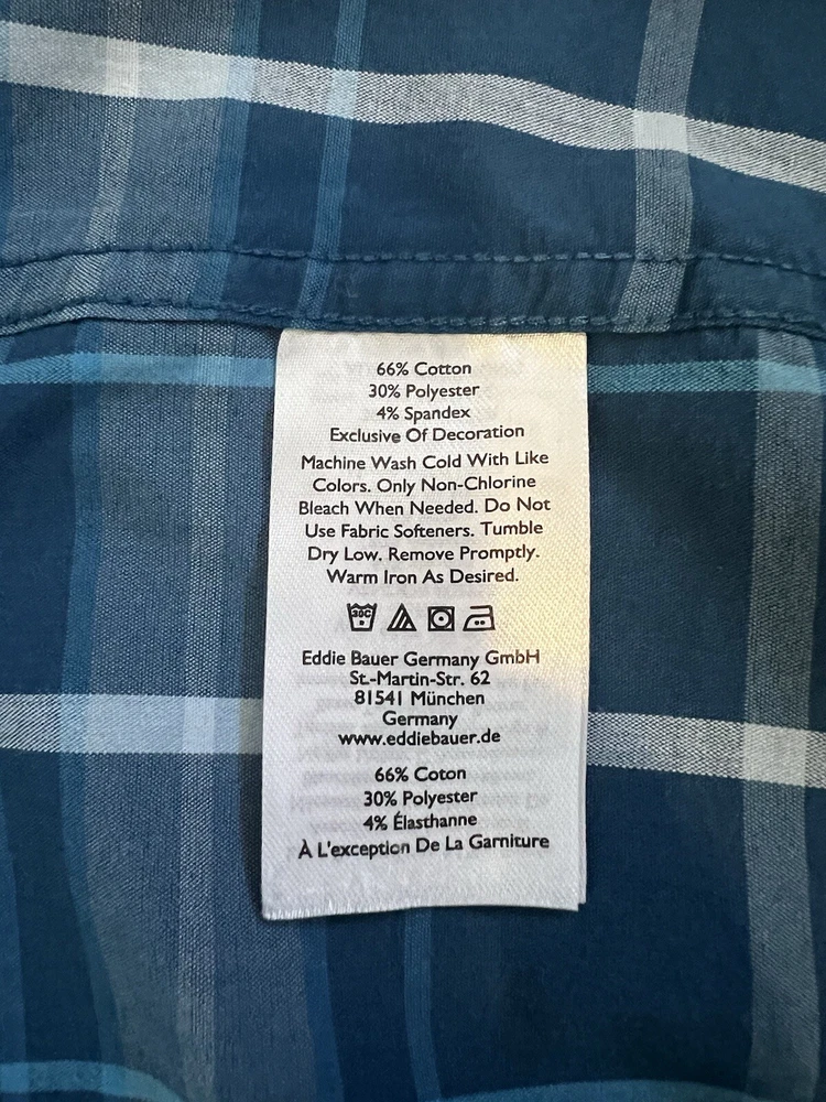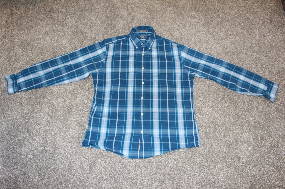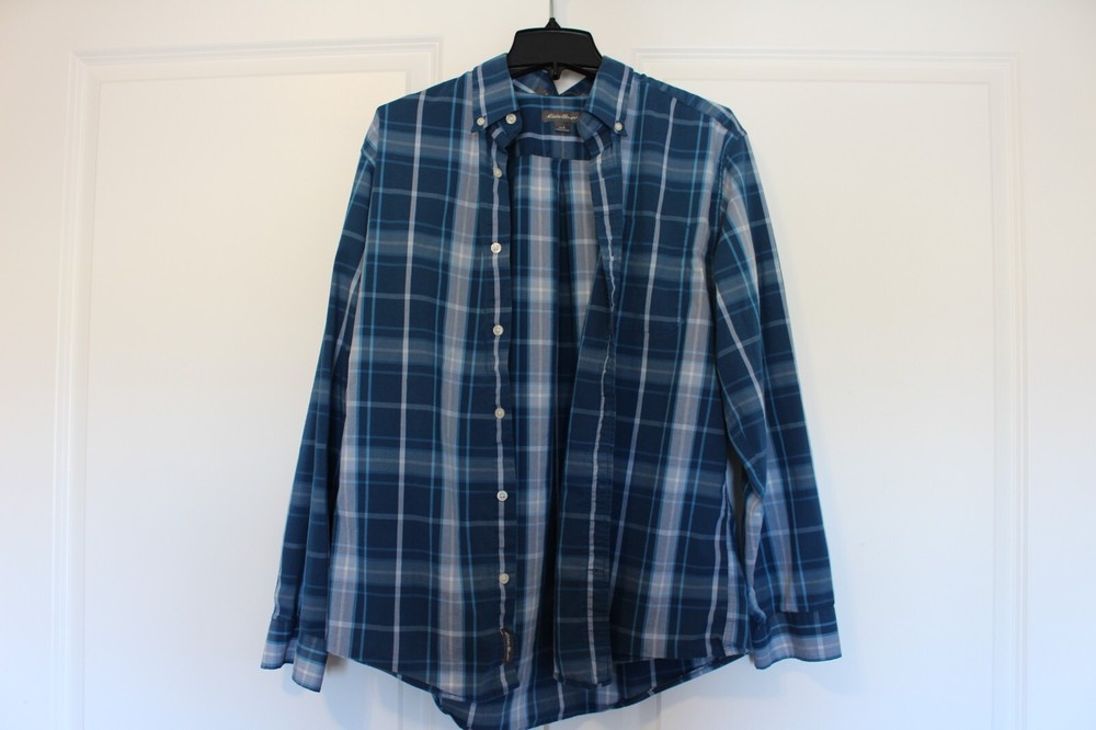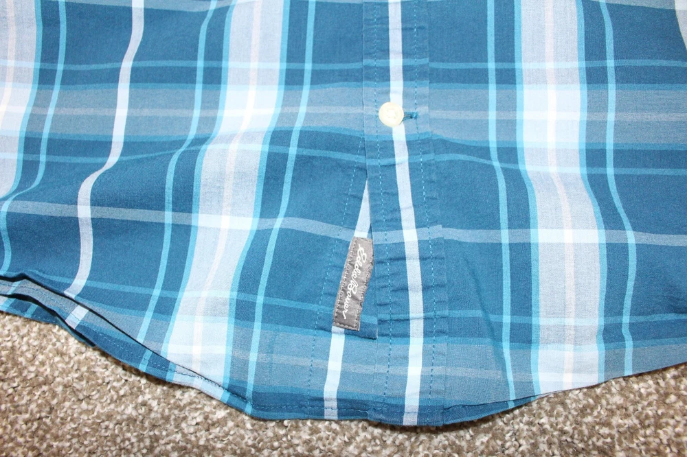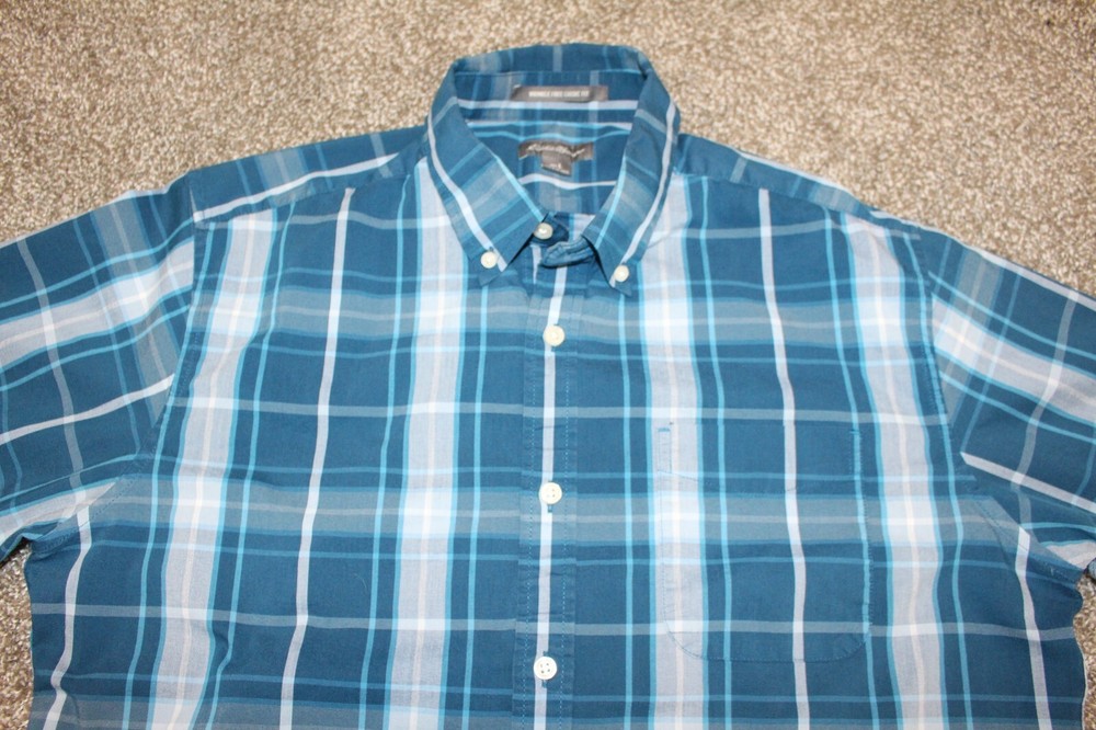 This Eddie Bauer button-down shirt is a must-have for any man's wardrobe. With a classic fit and wrinkle-resistant fabric, it's perfect for travel or casual occasions. The shirt features a blue plaid pattern, long sleeves, and a collared neckline with a button-down style. Made from comfortable cotton flannel, this shirt is machine washable and easy to care for. It also includes convenient pockets and is suitable for all seasons. The shirt is a size L with a colorful, outdoor theme making it a great addition to any outfit.