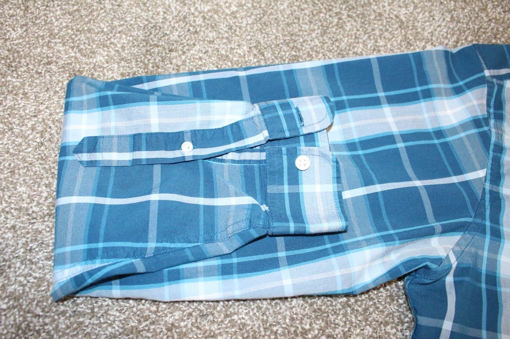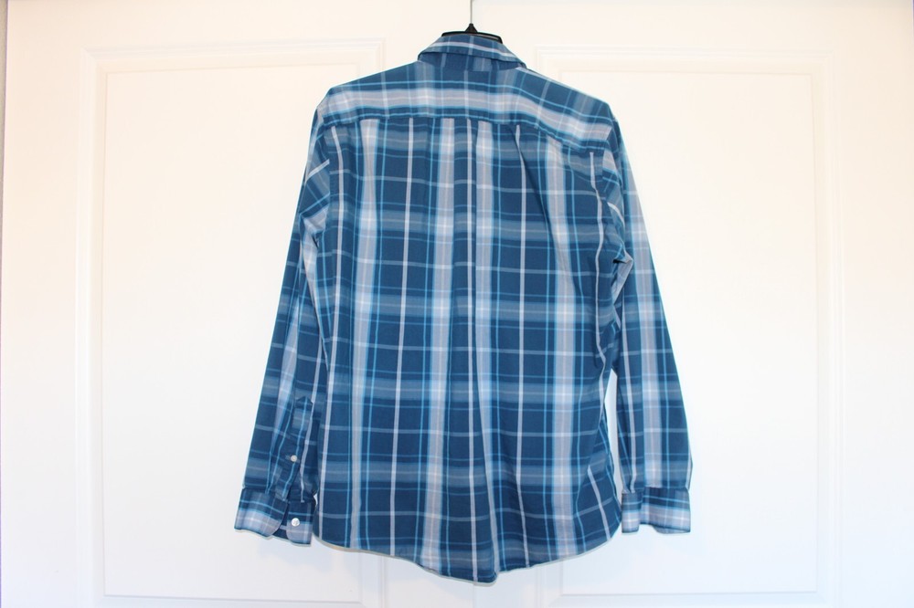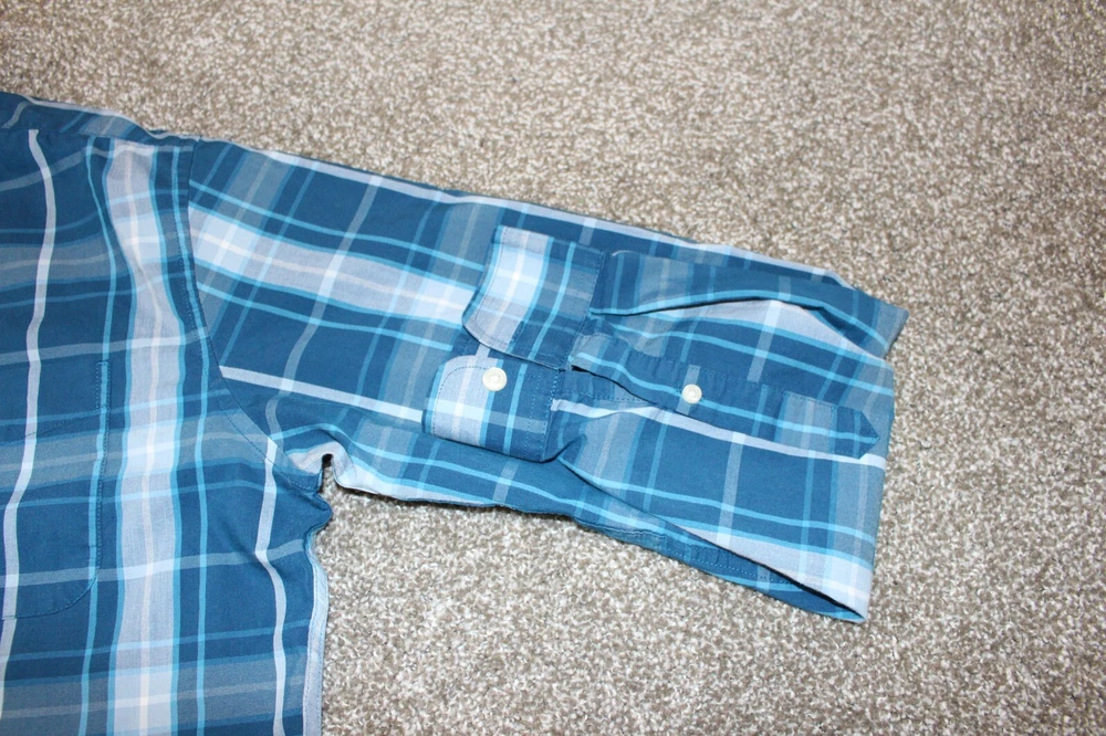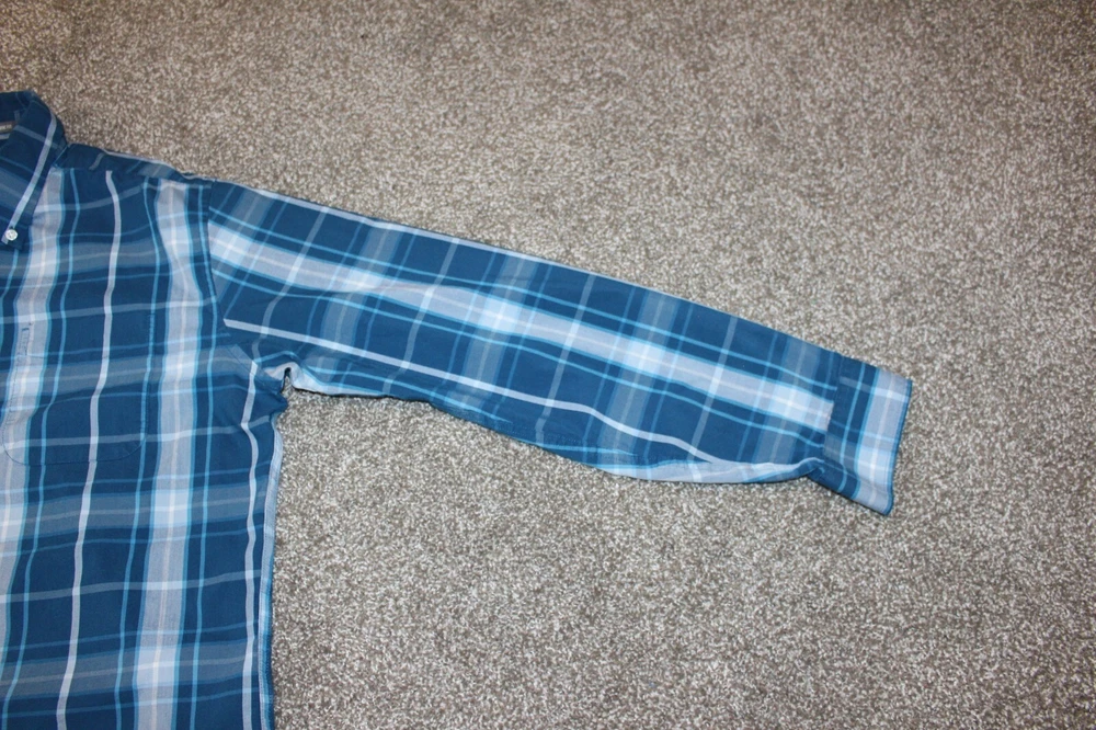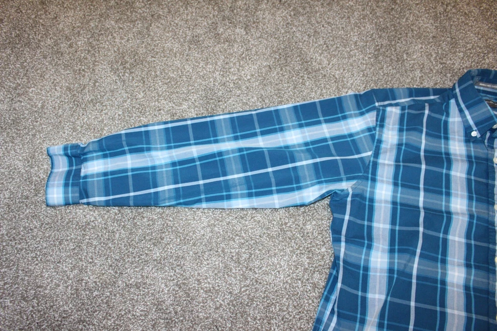 This Eddie Bauer button-down shirt is a must-have for any man's wardrobe. With a classic fit and wrinkle-resistant fabric, it's perfect for travel or casual occasions. The shirt features a blue plaid pattern, long sleeves, and a collared neckline with a button-down style. Made from comfortable cotton flannel, this shirt is machine washable and easy to care for. It also includes convenient pockets and is suitable for all seasons. The shirt is a size L with a colorful, outdoor theme making it a great addition to any outfit.