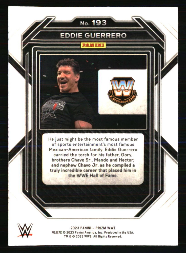 Insert Set: Silver Card Number: 193 Graded: No Set: 2023 Panini Prizm WWE Autographed: No Sport: WRESTLING Team: None Type: Sports Trading Card Year Manufactured: 2023 Season: 2023 Parallel/Variety: Silver Player|Athlete: Eddie Guerrero