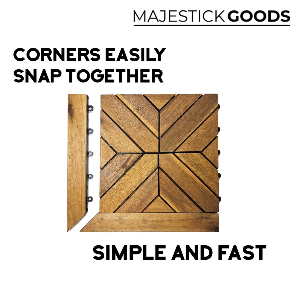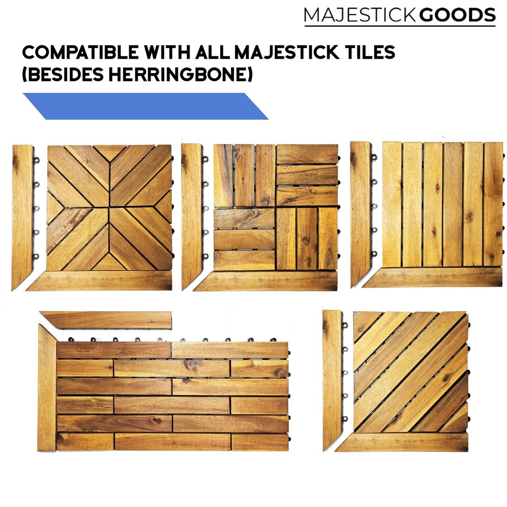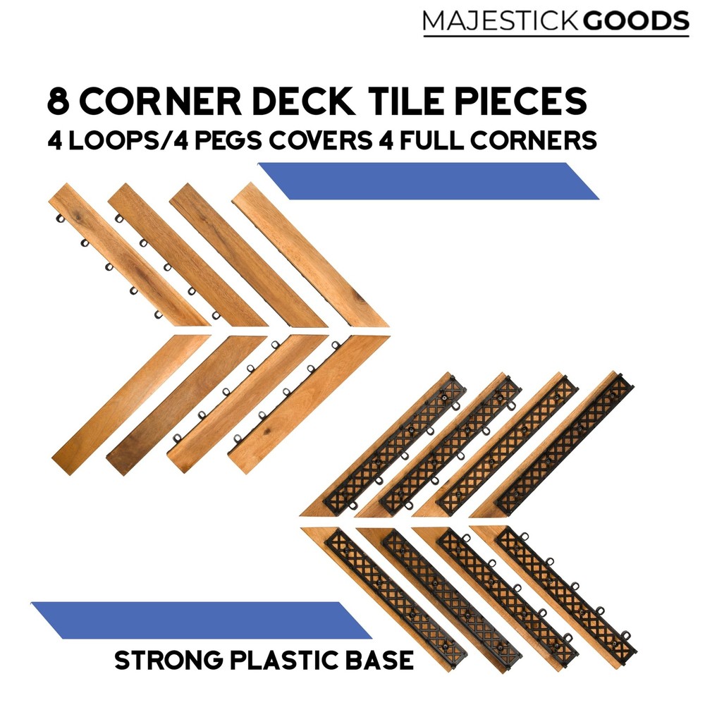 Edges for Interlocking Deck Tiles | Snap Together Edge for Wooden Flooring | Floor Decking Tile Edge - 12 x 12 Acacia Hardwood Outdoor Flooring Patio, Wooden Floor Balcony (Edge Corner 8 Pack) - Buy Now with Fast Shipping! Edges for Interlocking Deck Tiles | Snap Together Edge for Wooden Flooring | Floor Decking Tile Edge - 12 x 12 Acacia Hardwood Outdoor Flooring Patio, Wooden Floor Balcony (Edge Corner 8 Pack) Product Details Material: wood Brand: Majestick Goods Item dimensions L x W x H: 12 x 1 x 0.1 inches Color: Brown Shape: Square Product Dimensions : 12 x 1 x 0.1 inches; 2.81 Pounds Item model number : edge2024 Date First Available : February 19, 2024 Manufacturer : Majestick Goods Country of Origin : Vietnam Best Sellers Rank: #48,450 in Tools & Home Improvement (See Top 100 in Tools & Home Improvement) #33 in Decking #33 in Decking Customer Reviews: 3.8 3.8 out of 5 stars 35 ratings Key Features ✅ EDGES FOR INTERLOCKING DECK TILES: The simple solution for your patio, balcony, walkway, outdoor floor covering needs. These edge pieces make your deck tiles look even more sleek. ✅ SNAP TOGETHER WOOD FLOORING BORDER: Super easy click tile flooring edge, hassle free assembly. ✅ BEAUTIFUL ACACIA WOOD: High quality click together edges for smooth flooring. Edges slant down to lower the risk of tripping. ✅ RELATED: Apartment patio decor, azulejos para piso de madera para exterior. Bamboo hardwood flooring hardwood floor panels, cedar decking boards. Cheap outdoor flooring for patio floor covering, deck florring deck kit, deck lumber deck panels, diy patio and walkway ideas that work. Engineered hardwood deck tiles, fake hardwood flooring, outdoor patio flooring outdoor waterproof. Snap tile flooring outdoor platform deck block wooden floor, parquet flooring patio floring. ✅ MEASUREMENTS: 8 pack of 12" length x 1" width x 0.9" height. Only compatible with Majestick Goods deck tiles. Product Description