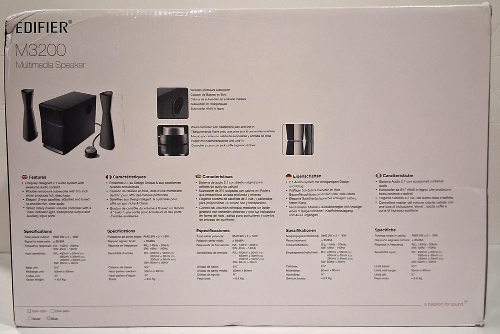 Elevate your audio experience with the Edifier Multimedia M3200 speakers, boasting a robust 34-watt RMS power output that ensures crisp, clear sound for all your multimedia needs. The 2.1 channel system includes a 5.5-inch driver, delivering an impressive sonic range, while the integrated subwoofer adds depth and richness to your audio landscape. Designed with functionality in mind, these speakers come in a sleek black and blue color, fitting seamlessly into any room. They offer both auxiliary and wired connectivity, a convenient wired rotary master volume controller, and an on/off feature for energy conservation. The wooden enclosed design not only enhances the aesthetic but also provides a sturdy, reliable base for the speakers, making them ideal for use with computers, televisions, and DVD players.