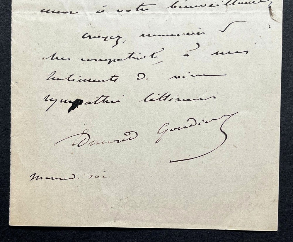 Lettre autographe signée de Edmond GONDINET . État : Très bon état, présence d'onglets au verso . Voir photos pour plus de détails. Dimensions : 10 x 16 cm. 1 page. Edmond Gondinet, né le 7 mars 1828 à Laurière, et mort le 19 novembre 1888 à Neuilly-sur-Seine, est un librettiste et dramaturge français. Il a fait jouer sur les scènes parisiennes une quarantaine de pièces, collaborant notamment avec Eugène Labiche et Alphonse Daudet. Wikipédia Envoi soigné dans un emballage rigide et étanche. Satisfait ou remboursé. Si vous n'êtes pas entièrement satisfait, je reprends la marchandise avec retour à ma charge pour l'Europe et à la charge de l'acheteur pour le reste du monde. N’hésitez pas à visiter ma boutique et affiner vos recherches en fonction des catégories qui vous intéressent. Ma boutique L'Art Délivré. Lettres autographes, vieux papiers, livres anciens, photographies, gravures, timbres… Nous expertisons et/ou rachetons dans toute la France vos lettres, collections de lettres et livres anciens. Merci de votre visite. Jérôme KAYSER. État : Très bon état, présence d'onglets au verso. Voir photos pour plus de détails. Edmond Gondinet, né le 7 mars 1828 à Laurière, et mort le 19 novembre 1888 à Neuilly-sur-Seine, est un librettiste et dramaturge français. Il a fait jouer sur les scènes parisiennes une quarantaine de pièces, collaborant notamment avec Eugène Labiche et Alphonse Daudet. Wikipédia Satisfait ou remboursé. Si vous n'êtes pas entièrement satisfait, je reprends la marchandise avec retour à ma charge pour l'Europe et à la charge de l'acheteur pour le reste du monde. N’hésitez pas à visiter ma boutique et affiner vos recherches en fonction des catégories qui vous intéressent. Ma boutique Lettres autographes, vieux papiers, livres anciens, photographies, gravures, timbres… Nous expertisons et/ou rachetons dans tou