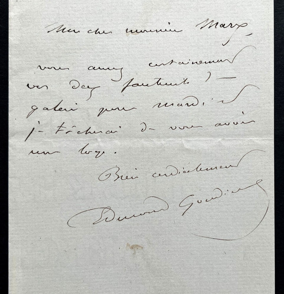 Lettre autographe signée de Edmond GONDINET . État : Très bon état, présence d'onglets au verso . Voir photos pour plus de détails. Dimensions : 9,7 x 15,5 cm. 1 page. Edmond Gondinet, né le 7 mars 1828 à Laurière, et mort le 19 novembre 1888 à Neuilly-sur-Seine, est un librettiste et dramaturge français. Il a fait jouer sur les scènes parisiennes une quarantaine de pièces, collaborant notamment avec Eugène Labiche et Alphonse Daudet. Wikipédia Envoi soigné dans un emballage rigide et étanche. Satisfait ou remboursé. Si vous n'êtes pas entièrement satisfait, je reprends la marchandise avec retour à ma charge pour l'Europe et à la charge de l'acheteur pour le reste du monde. N’hésitez pas à visiter ma boutique et affiner vos recherches en fonction des catégories qui vous intéressent. Ma boutique L'Art Délivré. Lettres autographes, vieux papiers, livres anciens, photographies, gravures, timbres… Nous expertisons et/ou rachetons dans toute la France vos lettres, collections de lettres et livres anciens. Merci de votre visite. Jérôme KAYSER. État : Très bon état, présence d'onglets au verso. Voir photos pour plus de détails. Edmond Gondinet, né le 7 mars 1828 à Laurière, et mort le 19 novembre 1888 à Neuilly-sur-Seine, est un librettiste et dramaturge français. Il a fait jouer sur les scènes parisiennes une quarantaine de pièces, collaborant notamment avec Eugène Labiche et Alphonse Daudet. Wikipédia Satisfait ou remboursé. Si vous n'êtes pas entièrement satisfait, je reprends la marchandise avec retour à ma charge pour l'Europe et à la charge de l'acheteur pour le reste du monde. N’hésitez pas à visiter ma boutique et affiner vos recherches en fonction des catégories qui vous intéressent. Ma boutique Lettres autographes, vieux papiers, livres anciens, photographies, gravures, timbres… Nous expertisons et/ou rachetons dans tou