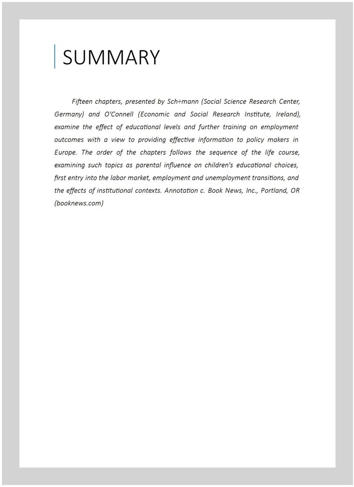 Education, Training and Employment Dynamics : Transitional Labour Markets in the European Union, Hardcover by Schomann, Klaus (EDT); O'Connell, Philip J. (EDT), ISBN 1840642785, ISBN-13 9781840642780, Brand New, Free shipping in the US Fifteen chapters, presented by Sch÷mann (Social Science Research Center, Germany) and O'Connell (Economic and Social Research Institute, Ireland), examine the effect of educational levels and further training on employment outcomes with a view to providing effective information to policy makers in Europe. The order of the chapters follows the sequence of the life course, examining such topics as parental influence on children's educational choices, first entry into the labor market, employment and unemployment transitions, and the effects of institutional contexts. Annotation c. Book News, Inc., Portland, OR ()