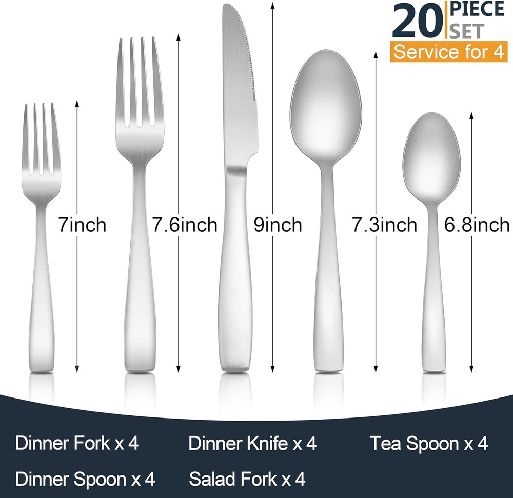 E-far Matte Silverware Set for 4, 20 Pieces Square handle, Silver Product Details Brand: E-far Number of Pieces: 20 Material: Stainless Steel Color: Matte Silver Product Care Instructions: Dishwasher Safe Recommended Uses For Product: Indoor, Outdoor Special Feature: Rust Resistant, Dishwsher Safe Finish Type: matte Included Components: 4 dinner forks, 4 dinner spoons, 4 dinner knives, 4 salad forks, 4 dessert spoons Style: Square handle Is Stain Resistant: Yes Is Dishwasher Safe: Yes Manufacturer: E-far Package Dimensions: 9.92 x 5.98 x 2.44 inches Item Weight: 2.81 pounds DURABLE STAINLESS STEEL: This 20 pieces tableware set are made of high-quality 18/0 stainless steel for anti-corrosion and rust free, Sturdy enough and not easily bent or damaged, Durable for long service life, Food grade stainless steel without harmful chemicals and nickel free, Non-toxic and healthy metal cutlery allows you to enjoy every meals COMFORTABLE TO GRASP: The silverware set has appropriate weight, suitable size and medium thickness just right to your hand, Ensure well balance and make you not easy to feel tired even holding for long time, Ergonomically-designed square end handle provide a suitable grip, make it feel comfortable in hands EFFORTLESS CLEANING: Dishwasher safe can free your hands, Save your time and labor with less hassle, make cleaning a breeze, Sleek line handle without any extra pattern, stain have nowhere to hide, Smooth surface for easy cleaning, Can remove the residue easily even by hand washing, Keep the flatware always looks like new ELEGENT AND WELL MADE: Classic square handle without any extra pattern makes the fork spoon and knife set looks elegant, Simple shaped silverware goes well with your existing tableware and decoration, Matte finished silverware are carefully sanded and turn out to smooth surfaces and round edges, Makes it safe to use without hurting your mouth MULTIPLE OCCASIONS: They’re perfect for family everyday meals and can use for more occasions: Gatherings, parties or BBQ, Also be a decent gift for wedding, housewarming, Thanksgiving, Christmas, birthday and more festivals, Suitable for business purpose to use at restaurants, hotels as well