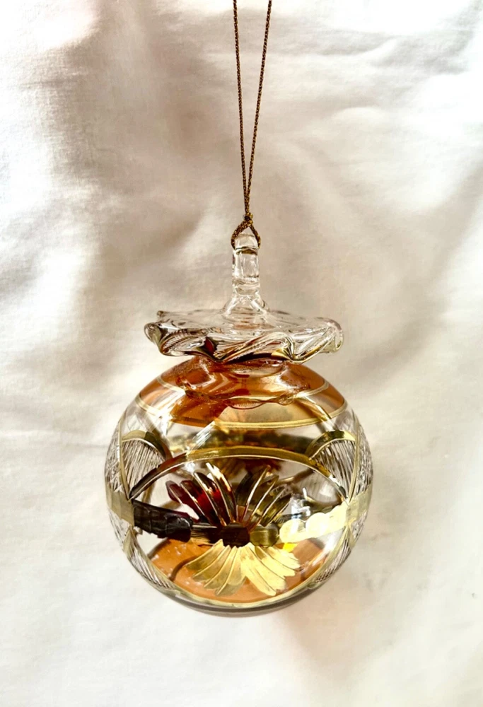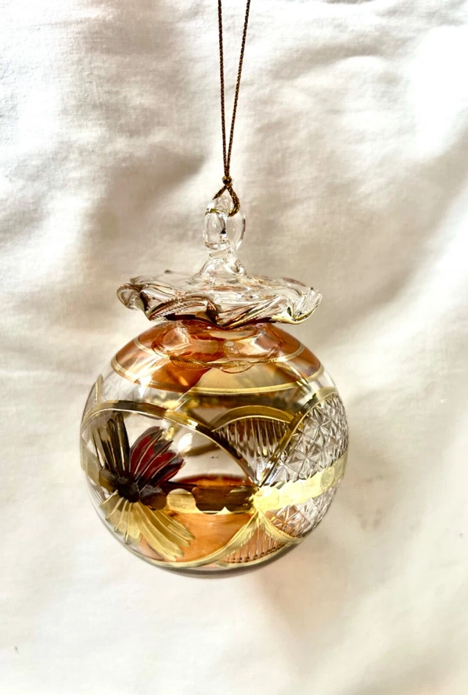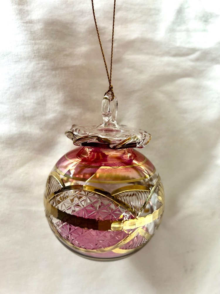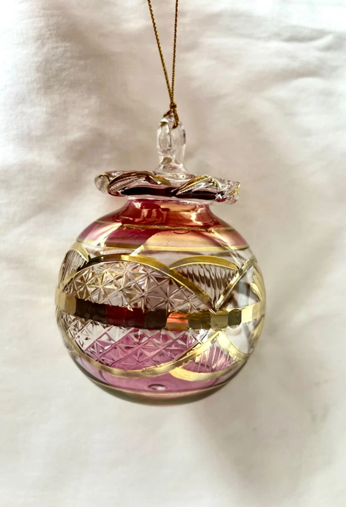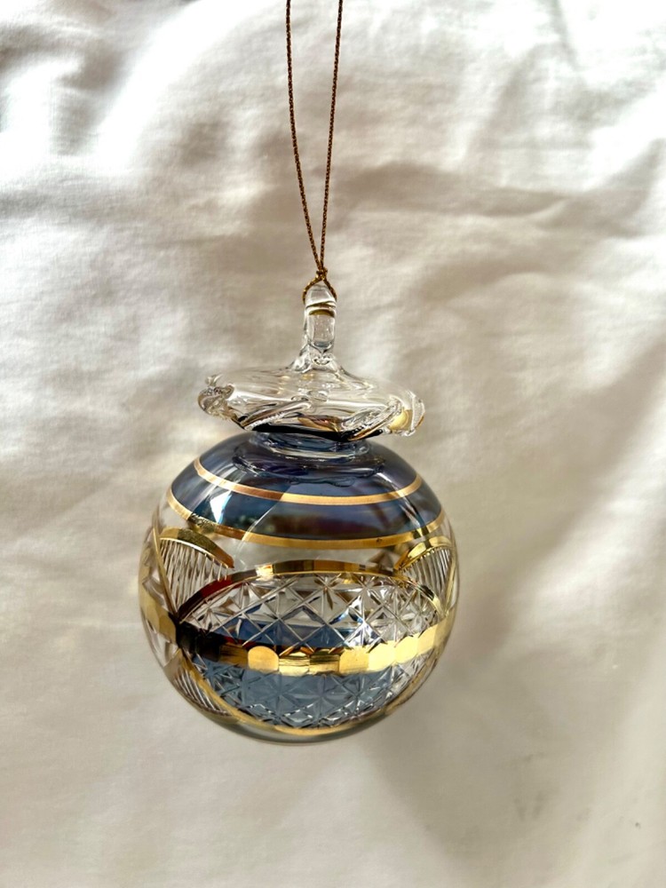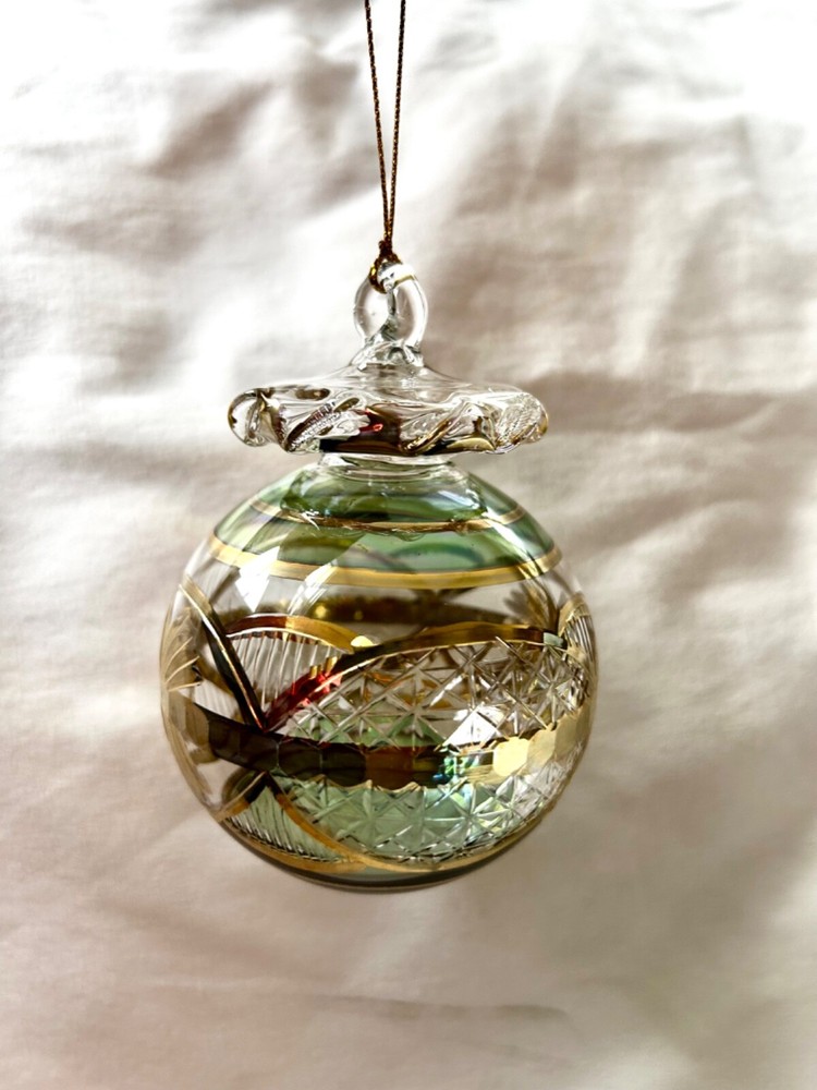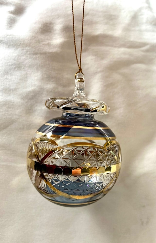 We sell only 100% Egyptian hand made products All our products are guaranteed in quality and sold at wholesale prices It is not just a gift. It is a real piece of art work from the land of the Pharaohs We ship directly from the U.S. =============== Egyptian Mouth Blown Glass Christmas Ornament Ball Shaped # 690 24K Gold Accent; Very Unique Size: Approximately 4" High X 3" Diameter Ornaments Are Uniquely Made Color May Vary Based On Availability Available Colors: Red / Green / Blue / Gold Specify Colors Preferred When Ordering Shipping cost : 1 Christmas Ornament within the U.S. is $5.99