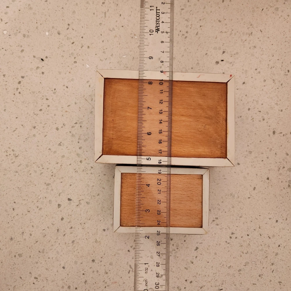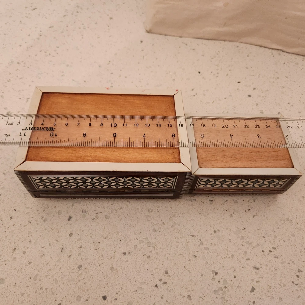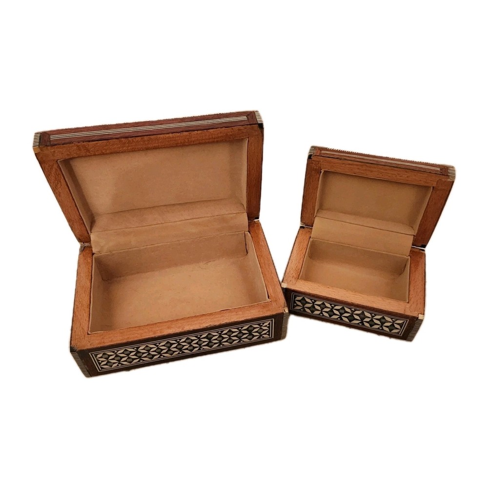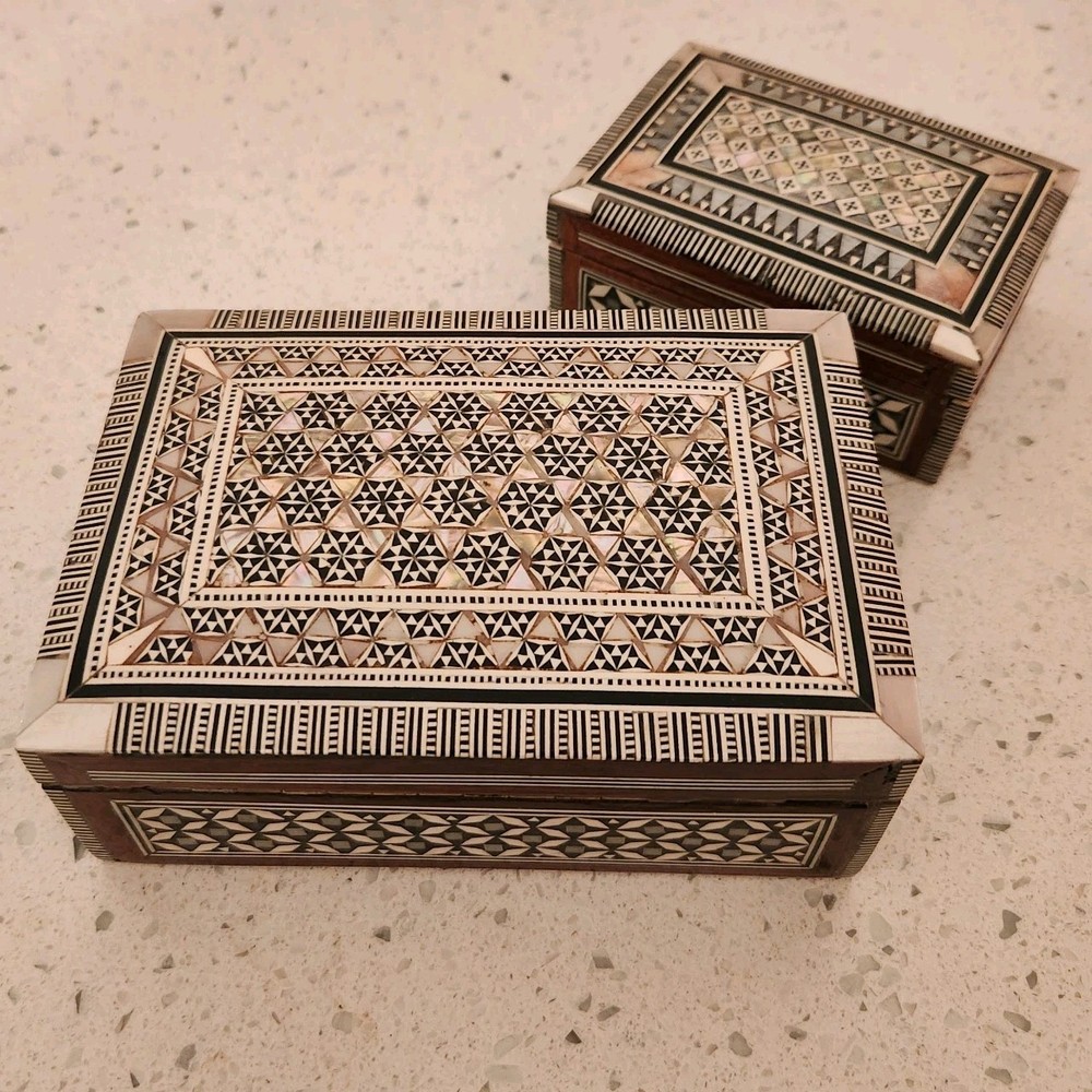 Set of 2 Mother of Pearl & wood trinket or jewelry box. Attached lids. 1 flaw in pearl on the smaller box, see pics for details. We did list at a lower price due to markings.