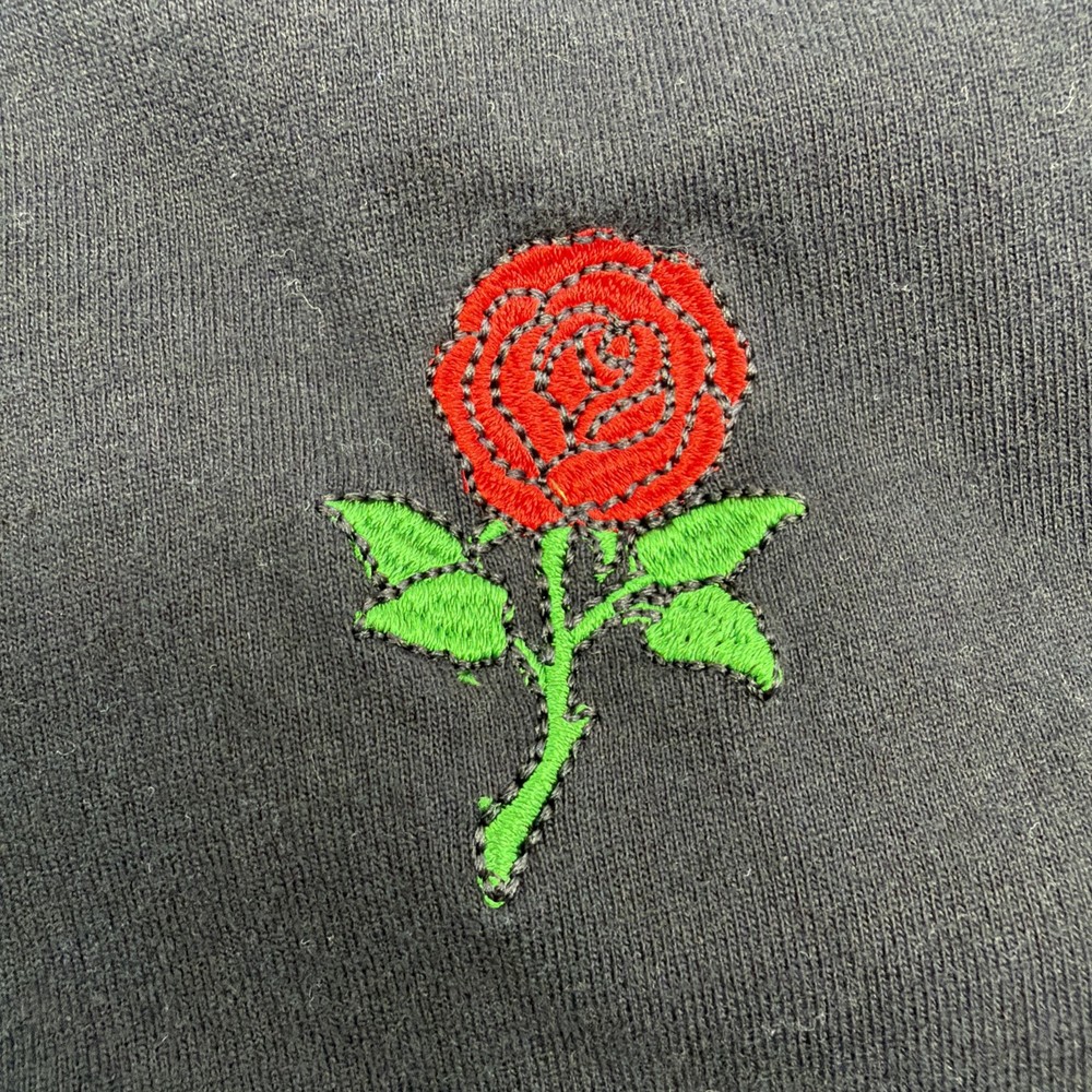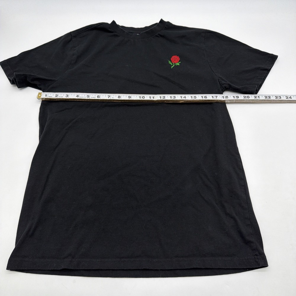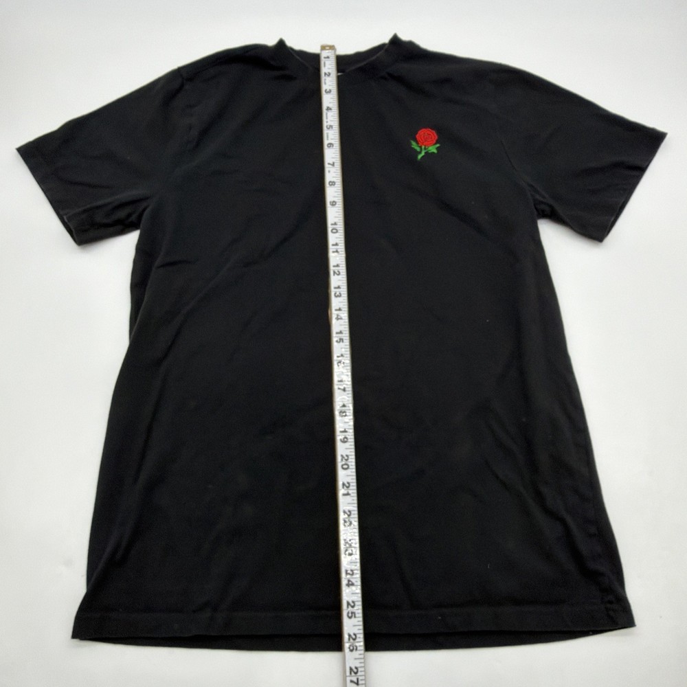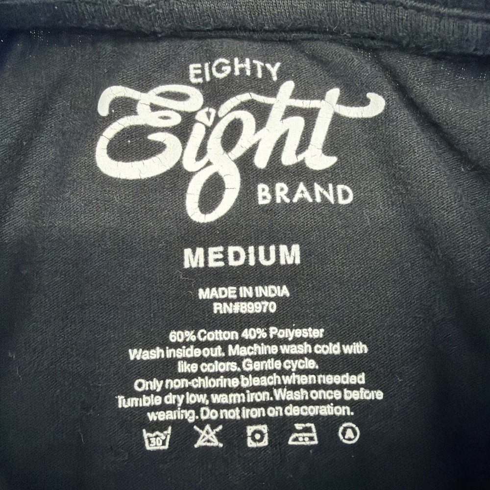 The Eighty Eight Brand T-shirt for men in size M features a black graphic print with an embroidered rose design, making it a stylish and trendy addition to any wardrobe. Made from a blend of polyester and cotton, this short sleeve crew neck T-shirt offers a regular fit, perfect for all seasons and suitable for both fall and spring wear. Designed by the Eighty Eight brand, this T-shirt is a statement piece that showcases a unique theme of love and beauty with its rose accents. Made in India, this shirt is high quality and versatile for any casual occasion. Check pictures for flaws and measurements