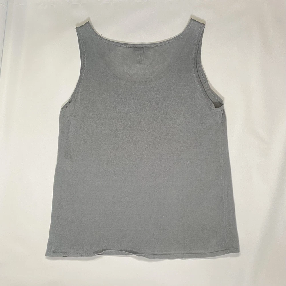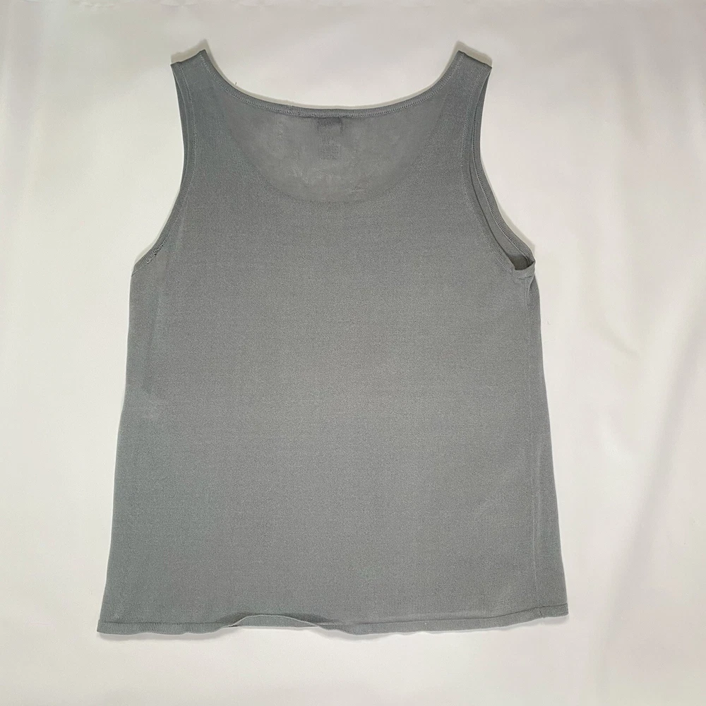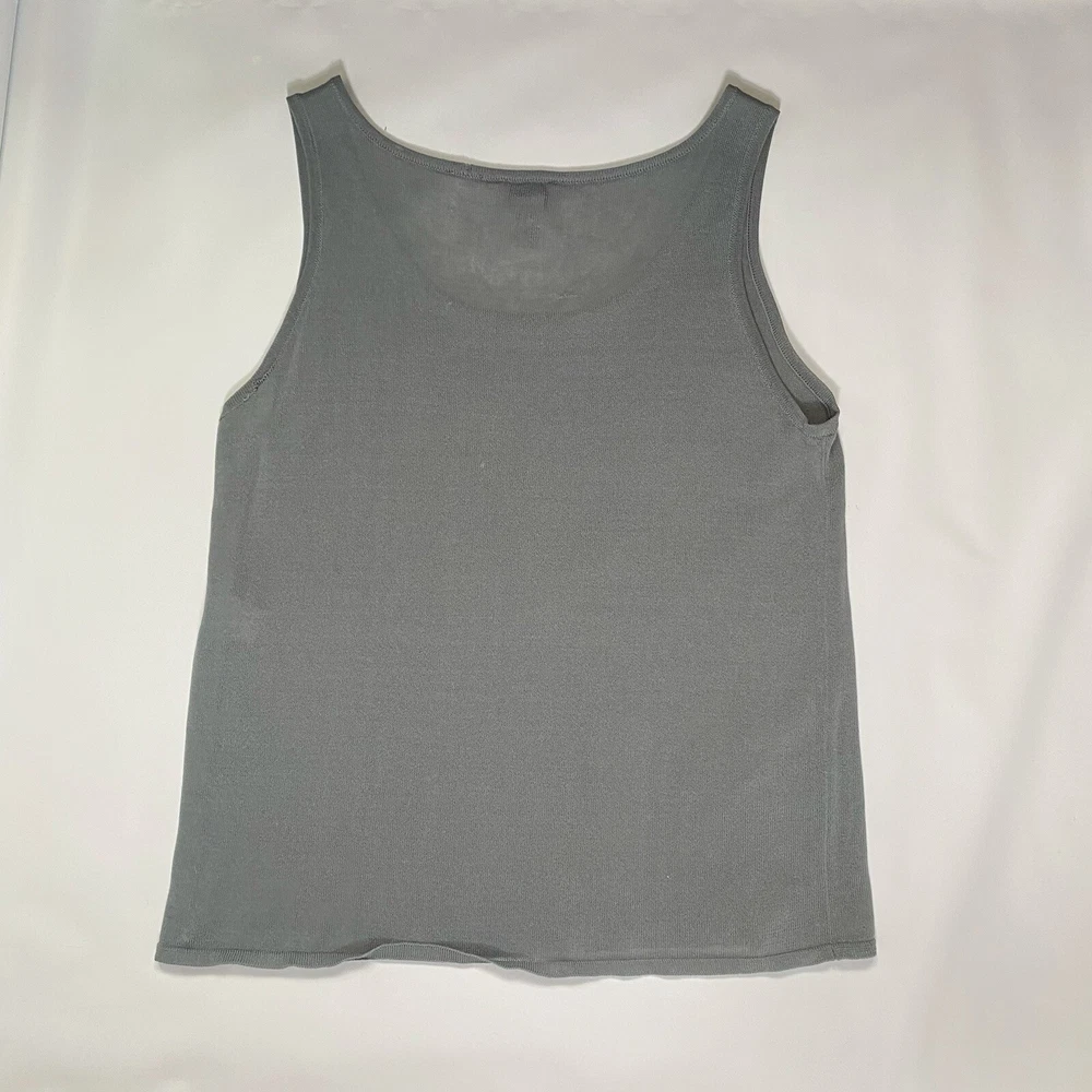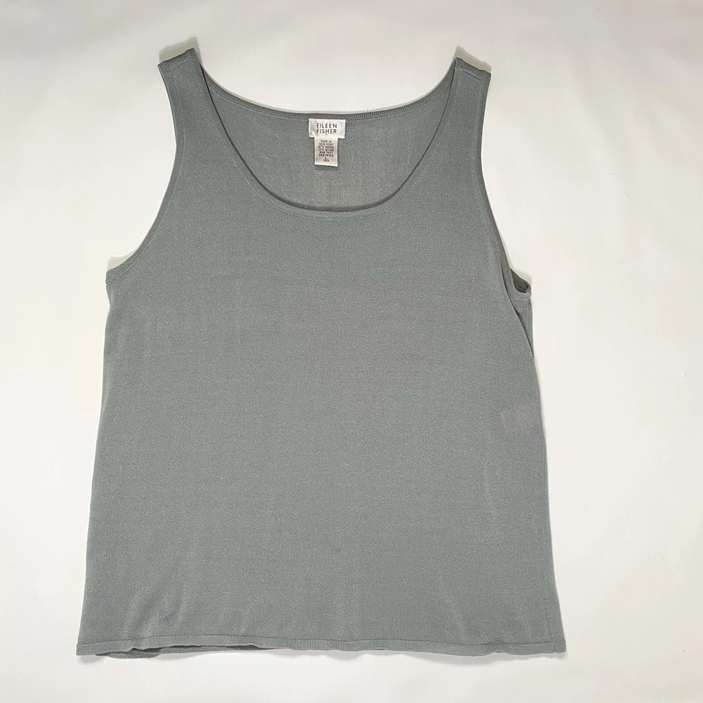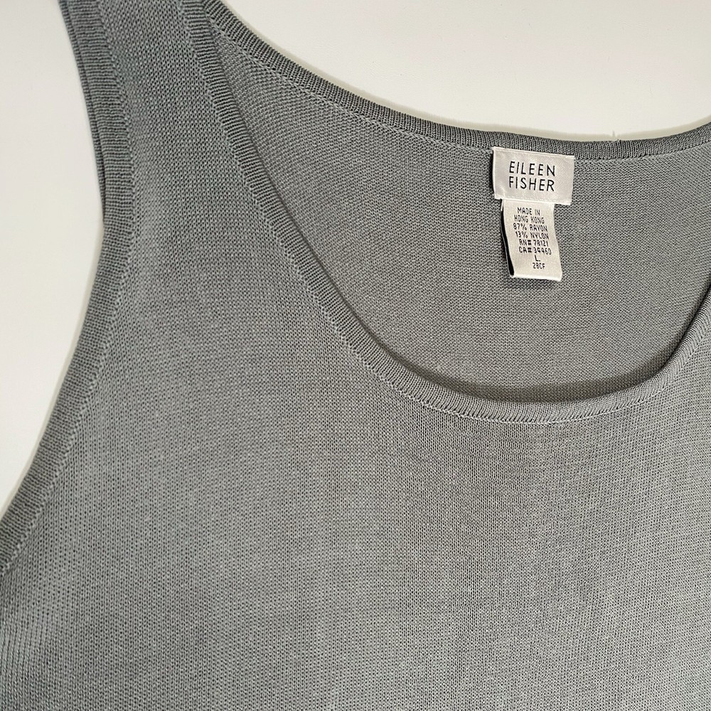 Eileen Fisher tank top in size Large with a scoop neck and sleeveless design The top is made of woven textured rayon material in a gray-blue color. It is a lightweight and breathable piece, suitable for casual wear in summer, fall, and spring. The wide strap tank has a basic style and a designer, classic theme, perfect for a versatile wardrobe.