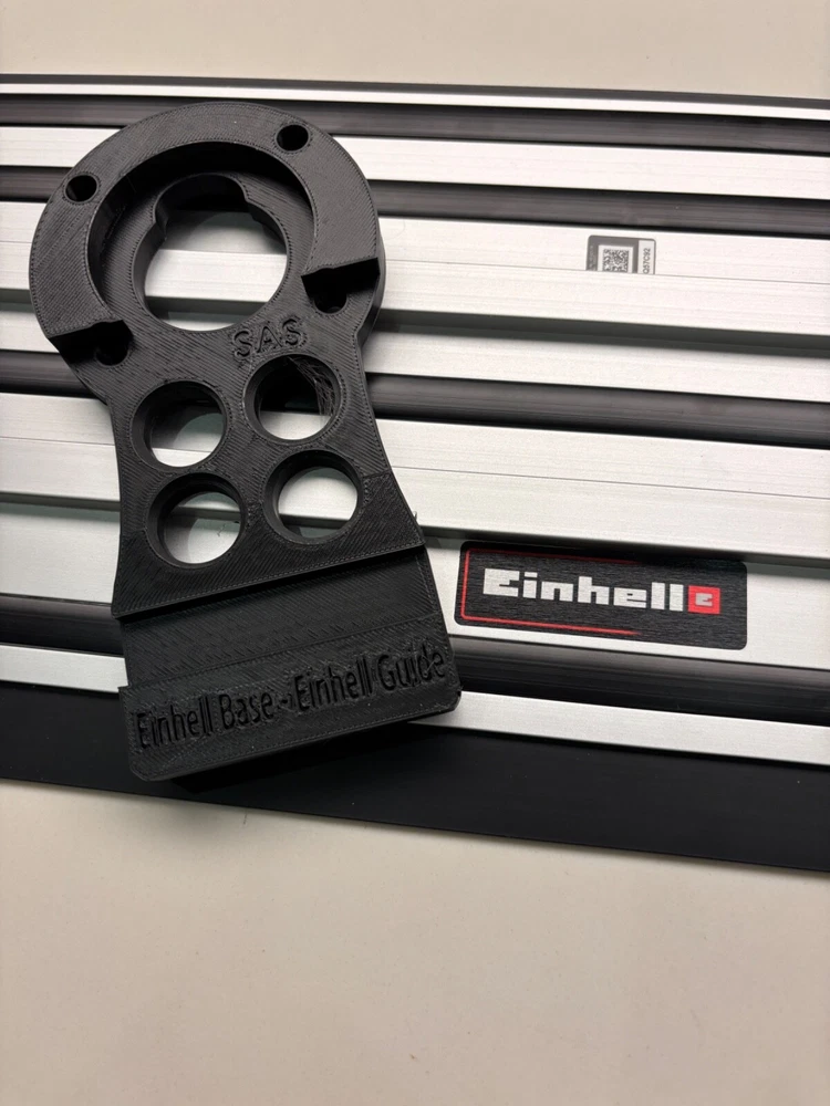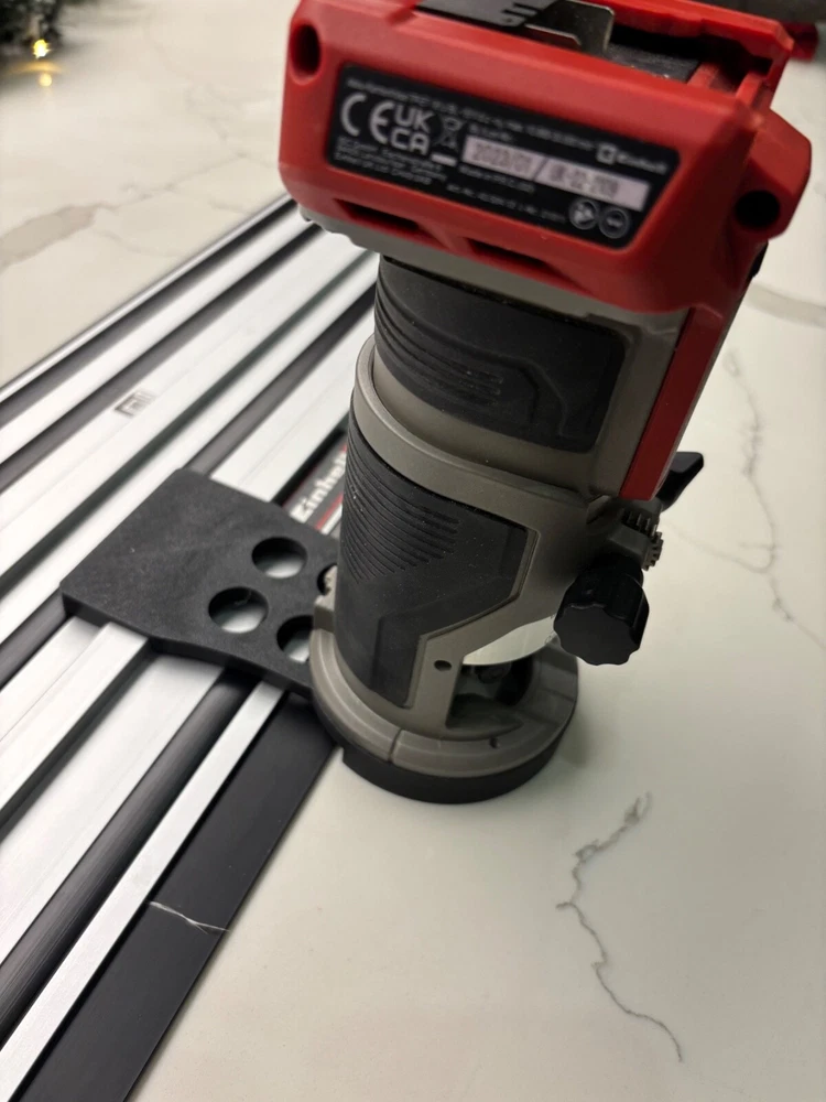 Einhell TP-ET 18 LI BL Router Guide Adaptor to fit Einhell Plunge Saw Track / Saw Guide Rail Features: Adapts Einhell Router/Trimmer (plunge base attachment ) to use on Einhell plunge saw guide rails Fits straight on to router base with the manufacturers screws. Easy to perform straight cuts Supplied with: Base plate Please note Guide rail and router not included 3d printed part Made from PLA Colour may vary Not an OEM product Made in the UK Please contact me when encountering issues when ordering, or go to www.plaworkshop.com
