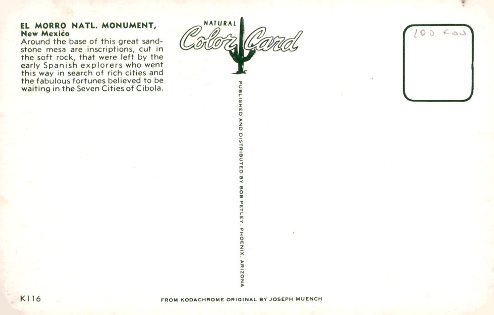 Discover inscriptions by early Spanish explorers on the sandstone mesa base, seeking treasures in Seven Cities of Cibola. This natural color card captures the historic legacy.