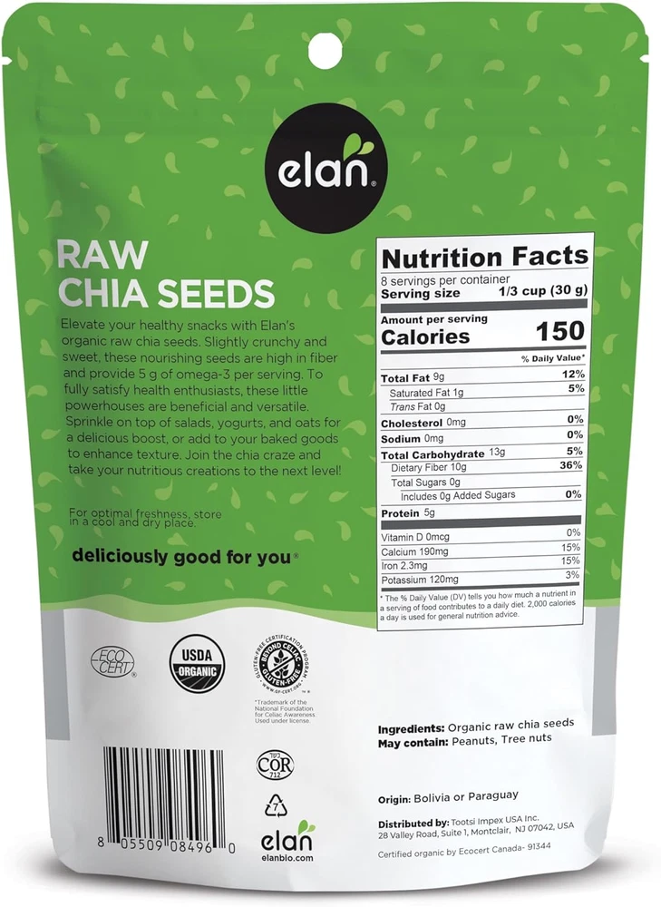 NUTRITIOUS SUPERFOOD: Elevate your healthy snacks with Elan Organic Chia Seeds. These small crunchy seeds gel easily, offering a nutritious boost to your creations GET CREATIVE: Add these chia seeds to a variety of recipes to enhance nutrition and texture. Perfect for overnight oats, chia pudding, and baked goods, these superfood seeds are ready for healthy snacking OMEGA-RICH: A source of omega-3 and omega-6 fatty acids, fiber, protein, calcium, and iron, these chia seeds support digestive health and contribute to overall well-being PROUDLY CERTIFIED: Organic (USDA & Ecocert), Gluten-Free, and Kosher, ensuring high-quality standards for health-conscious snackers ALL-NATURAL: Elan Chia Seeds are GMO-Free, sulphite-free, vegetarian, vegan, and without additives, making them a wholesome choice for everyone STORAGE: Keep these chia seeds in a cool, dry place to maintain optimal freshness and flavor Chia seeds are an important source of omega-3 and omega-6, two essential fatty acids that our bodies cannot produce on their own.
