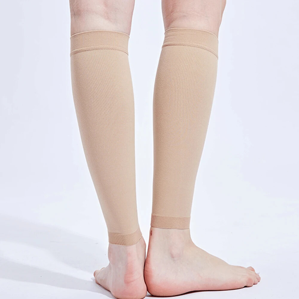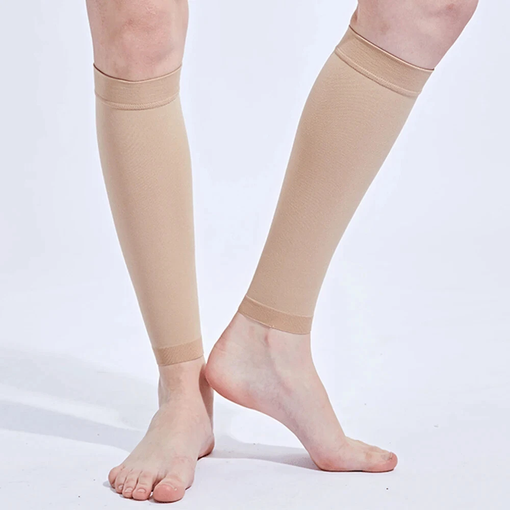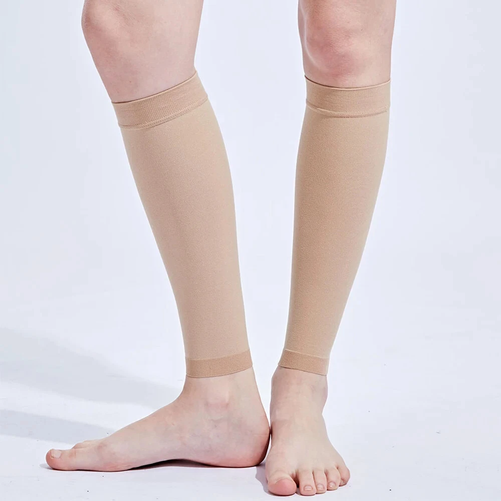 About the product: 1. Functions: 21-32 mmhg secondary pressure Calf Compression Sleeves Get your blood circulating. Great for relief of varicose veins, shin splints, calf compression, calf cramps or other leg swelling issues. Prevent blood clots after surgery and fits well unlike other doctor prescribed stiff varieties. These sleeves allow you to recover faster & feel stronger. 2. Size: S/M/L/XL/XXL, suitable for calf circumference between 25-45cm/9.8-18inch, fits unisex. Discreet and stylish design for walking, sitting, standing, travel and all attire from casual to work, dress or formal. 3. Multi applications: used for fatigue, pain, stiffness, soreness, swelling, cramps, shin splints, varicose veins, lymphedema, phlebitis, DVT (deep vein thrombosis), blood clots and plantar fasciitis. 4. Comfortable material - Made of durable, lightweight, breathable, high-quality lycra materials and superior moisture wicking yarns for ultimate comfort and breathability. Painstakingly measured to ensure an exact fit, they fit just right on your calf, not too tight, they're so comfortable that you'll forget you have them on! 5. Daily use and many activities - Our calf compression sleeves are ideal for daily use especially for people in retail, nursing, travel, hospitality & jobs that require you to be on your feet a lot. They are also perfect for running, walking, cycling, basketball, baseball, volleyball etc. Multi applications: Used for fatigue, pain, stiffness, soreness, swelling, cramps, shin splints, varicose veins, lymphedema, phlebitis, DVT (deep vein thrombosis), blood clots and plantar fasciitis. Daily use and many activities Our calf compression sleeves are ideal for daily use especially for people in retail, nursing, travel, hospitality & jobs that require you to be on your feet a lot. They are also perfect for running, walking, cycling, basketball, baseball, volleyball etc. Details: Gender: unisex. Condition: 100% new Item type: Calf Compression Sleeve Material: lycra Color: black/beige Secondary pressure: 30-40mmhg Applicable season: spring, summer, autumn, winter. Size: S--- Calf max circumference: 26.5-37cm/10.4-14.6inch Leg max circumference: 39-55/15.4-21.7inch Naked min circumference : 16.5-20.5cm/6.5-8inch M --- Calf max circumference: 29-39.5cm/11.4-15.6inch Leg max circumference: 44.5-61cm/17.5-24inch Naked min circumference : 20.5-24.5cm/8-9.6inch L --- Calf max circumference: 32-43cm/12.6-16.9inch Leg max circumference: 49.5-66cm/19.5-26inch Naked min circumference : 24.5-28cm/9.6-11inch XL --- Calf max circumference: 34.5-44.5cm/13.6-17.5inch Leg max circumference: 56-71cm/22-28inch Naked min circumference : 28-32cm/11-12.6inch XXL --- Calf max circumference: 36-47cm/14.2-18.5inch Leg max circumference: 61-76cm/24-30inch Naked min circumference : 32-36cm/12.6-14.2inch Suggestion: Due to the poor pressure and high sensitivity of the older, the older above 45 years old please choose large size than your normal wearing size. Package include: 1Pair * Medical Calf Compression Sleeves The best of health! When you receive the parcel, if the product has problems, please don't give bad review. Simply contact us promptly and we will help you solve.