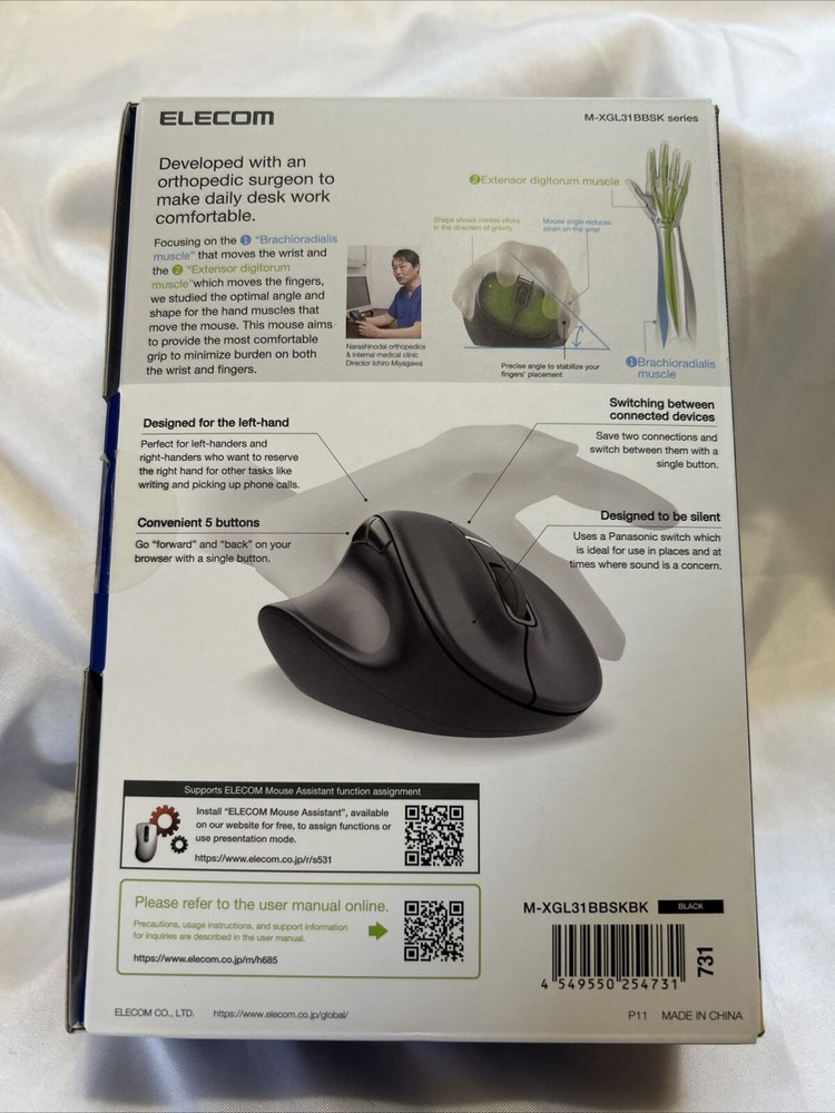 Left handed mouse developed together with a physician for ultimate comfort! Takes 1 double A battery not included. Comes with original box.