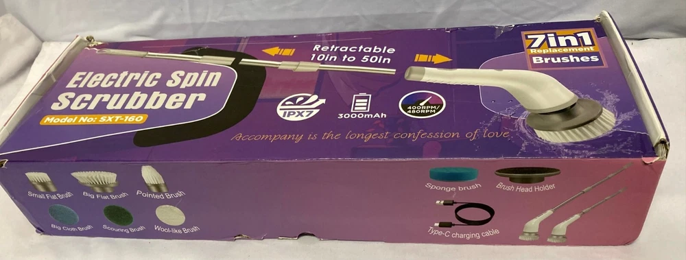 Tracking Number is provided for all listings! -- All items will be shipped out within 0-1 days after purchase! Feel free to ask us any questions you may have for our listings! -- Electric Spin Scrubber, Shower Cleaning Brush, 2 Adjustable Speeds Cordless Power Spinning Cleaner Brush with 7 Replaceable Brush Heads for Tile, Tub, Sink, Wall, Bathroom SXT-160 25watts USB TYPE C CHARGES IN 3 HOURS 90 Minute use time 3000mah 2 rotating speeds - 400rpm/480rpm