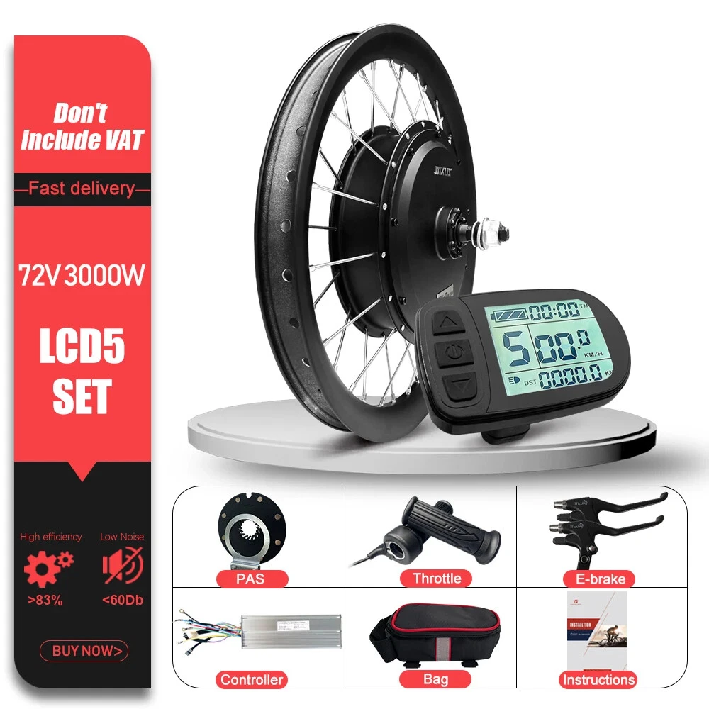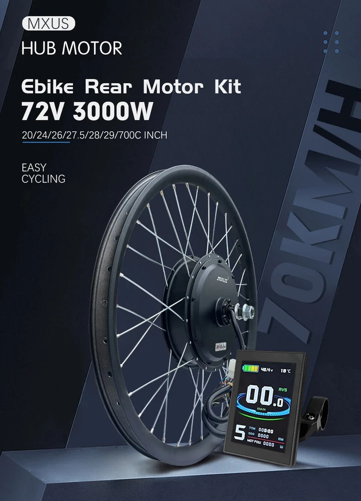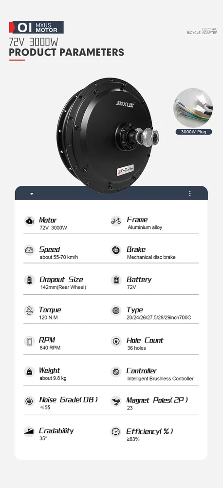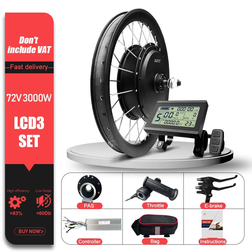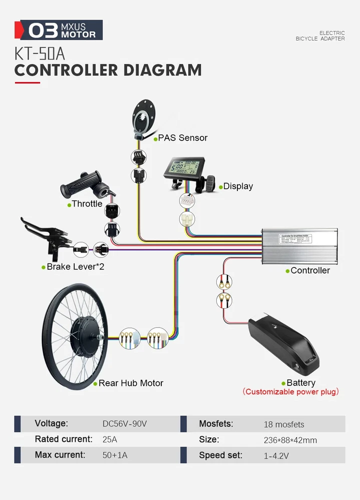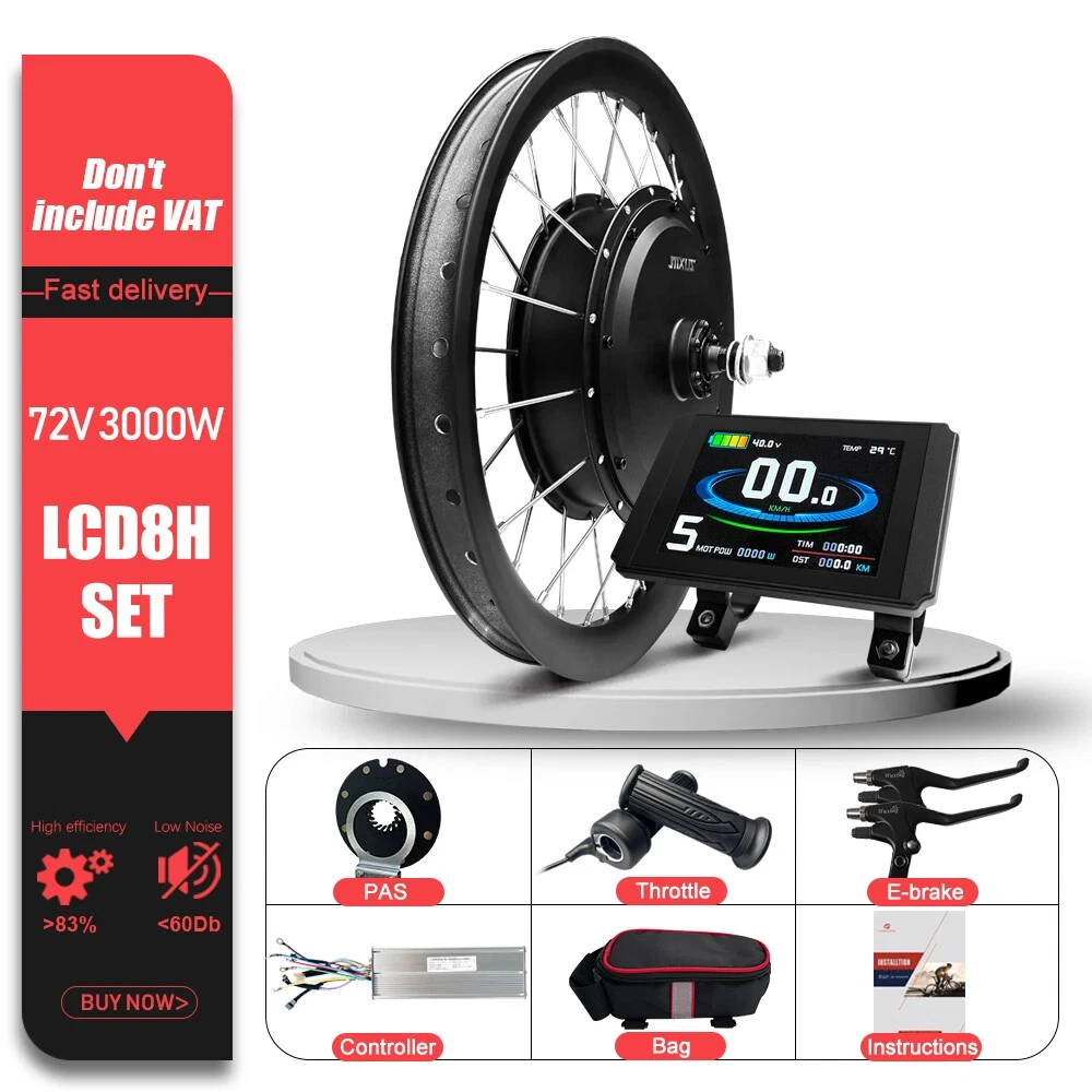 72V 3000W Motor Specification: ●Rated Speed(KM):55-70km/h ●Rear Fork size(mm):142mm ●Speed (Rpm):840rpm ●Torque (N.M):120n.m ●Motor weight (kg): about 8.8kg 50A Controller: Attention: The maximum current that the controller can pass is 50A, please do not exceed it, and we refuse to compensate for damage to the controller due to this ●Dimension: 236* 88 * 42 mm ●Weight: 800g ●Cable length : all about 13-15cm ●Mosfets : 18 mosfets ●Maximum current: 50±1A ●Rated voltage: DC56V-90V ●Speed set: 1-4.2V ●Rated current: 25A ●Brake input : Low-Level ●Low voltage protection: DC56±0.5V Packaging List ●1 PCS * Hub Motor with Rim and Spokes ●1 PCS * Motor Controller ●1 PCS * Display ●1 PCS * Thumb Throttle (We default to ship thumb throttle, it can be changed to twist throttle if you need) ●1 PCS * PAS Sensor ●1 Pair * Brake Levers(We default to shipBrake Levers, it can be changed to Brake Sensors if you need) Gifts: 1 * Controller Bag( not battery)+1*Install cable ties and stretch film+1*Installation Manual