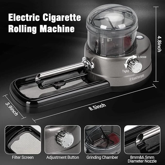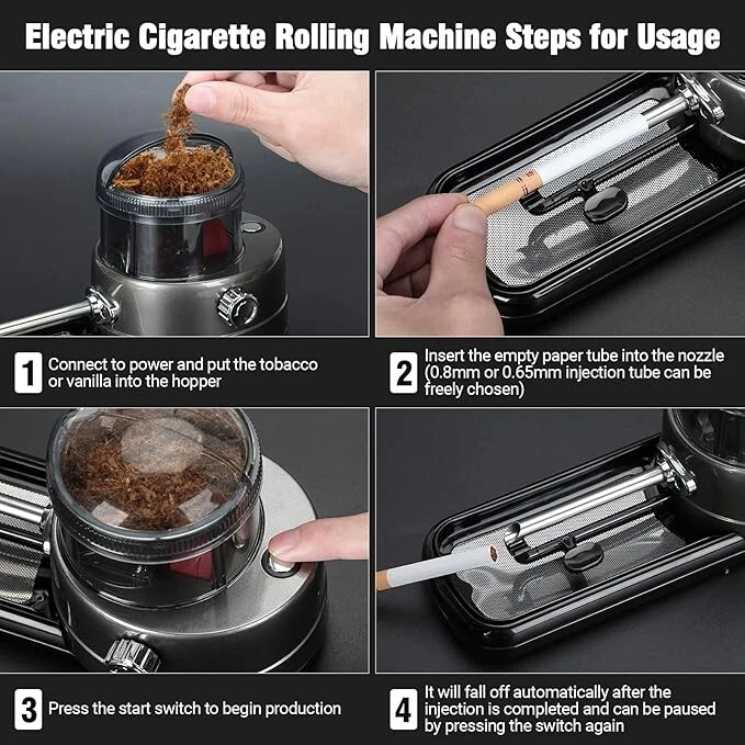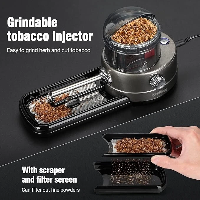 Electric Cigarette Rolling Machine, Portable Tobacco Injector Machine can Grind High quality: Cigarette rolling machine using environmentally friendly materials and high quality stainless steel,Safer and more durable;easy to operate design,Whether you are newer or experienced,It all meets your needs for grinding and filling vanilla,tobacco. Perfect cigarette injector: Simply place the tobacco or herb to be injected into the hopper and start grinding and injecting,Rotary button on the side can adjust the injection density;Cigarette injector can grind and inject with high efficiency,saving time and effort Easy to use: Electric cigarette injector with scraper and filter screen,Easy to filtering of fine powders.Two different sizes of injection tubes,Cigarette rollers are equipped with 6 non-slip pads to ensure comfort and stability of use. Best Gift: Electric cigarette rollers with power adapter, cleaning brush, cleaning probe, screwdriver, scraper, filter screen, cone loader,Simple to operate, easy to use, perfect gift for any smoking lover, best gift for Father's Day, Valentine's Day, Christmas, Thanksgiving.