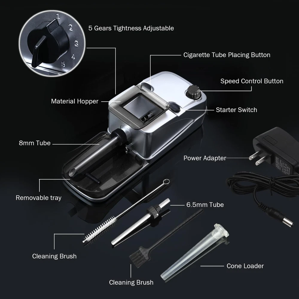 3 in 1 Design: Our Electric Cigarette Rolling Machine has 2-diameter cigarette tubes (0.31''/ 8 mm and 0.26''/ 6.5 mm) and 1 pre-roll cone loader. It's great for King/Regular size cigarettes and pre-roll cones. Two metal tubes can be freely switched, just unscrew the spiral knob and replace it with another tube. Pre-rolled cone loader should be used on 8mm diameter tubes. 5 Gears Adjustable: The side of our Electric Cone Rolling Machine is equipped with a 5-gear adjustable feature of tightness. With a user-friendly knob, you can effortlessly customize the tightness of your cones or cigarettes to suit your personal preferences. Easy to Use: The cigarette injector features a top rotary switch for speed adjustment, taking just seconds to complete operation. Simply choose the suitable metal tube, place the cut tobaco, adjust the speed and tightness, and press the switch for automatic cigarette making. The removable tray allows for easily pouring the leftover tobaco back into the hopper, eliminating any waste. High-Quality Set: Say goodbye to troublesome manual cigarette rollers and try our new automatic cigarette roller machine! Our pre-roll machine is built with premium stainless steel and ABS. With its portable size, it can be taken away conveniently. Great Choice: Our automatic tobaco roller maker comes with a US ada-pter, 2 metal tubes, 1 cone loader, and 1 cleaning brush. Perfect choice for any smoking lover, and the best choice for Father's Day, Valentine's Day, Christmas, or Thanksgiving. Product Description